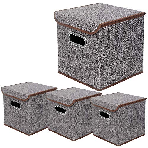 Storage Bins provide a simple and fashionable solution to your office, home, and any other spaces of storage needs. To provide a solution to keep closets, shelves, and organized. Features -Two handles design, convenient to carry -Lid design, dustproof, protect your clothes from moisture -Cardboard of sides and bottom, keep a good shape even when empty. -Collapsible to fold flat when not in use, making it easy to store. Multi-Purpose Usage -Closet & room clothes, DVD, book, media. -Laundry room, magazine organizer, file organizer, etc. -Car and vehicle garage. -Child and kid room, listing room, office, bedroom. -Standard cube shelf or closet shelf, cube organizer, etc. -Photograph Storage. -Beauty, makeup, and hair supplies storage. -Kids toy, plush, and clothes storage. -Dog, cat, and pet toy and treat storage -Linen and towel storage Dimensions 10 x 10 x 10 inches (25 x 25 x 25cm) Material Woven Fabric Color Gray with Brown Trim Quantity: Set of 4