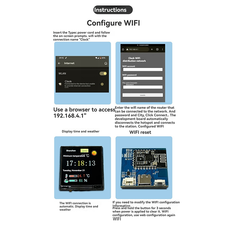 l Configure the wifi mode. After connecting to the wifi, you can display parameters such as time, weather, temperature and humidity. Configuration