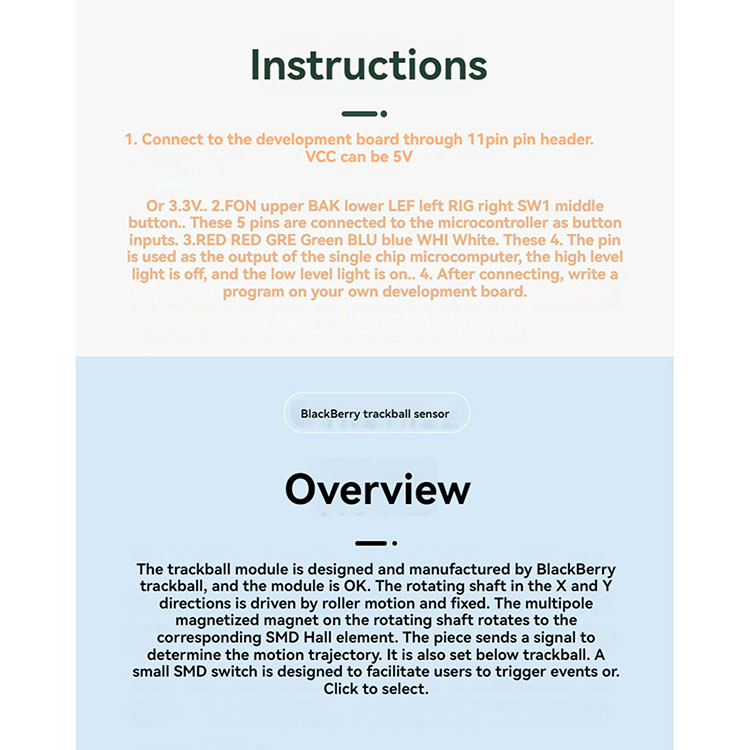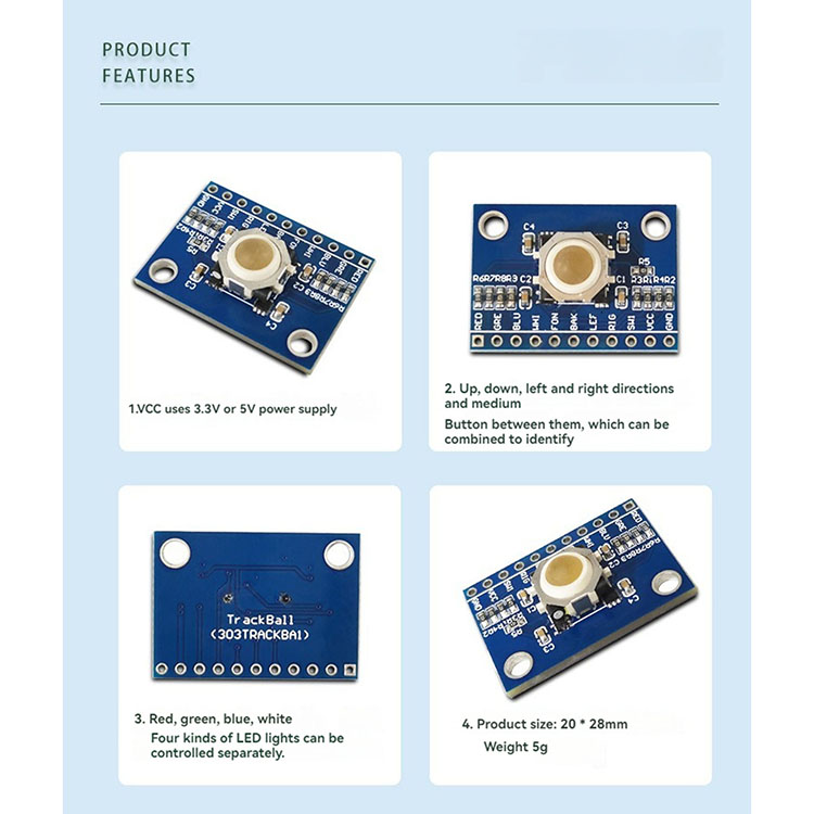 l Adopting the Blackberry trackball design, the module can drive the X and Y direction of the rotary axis through the roller movement, through the fixed on the rotary axis of the multi-pole magnet magnet rotation, the corresponding SMD Hall components to send a signal, so as to determine the trajectory of the movement