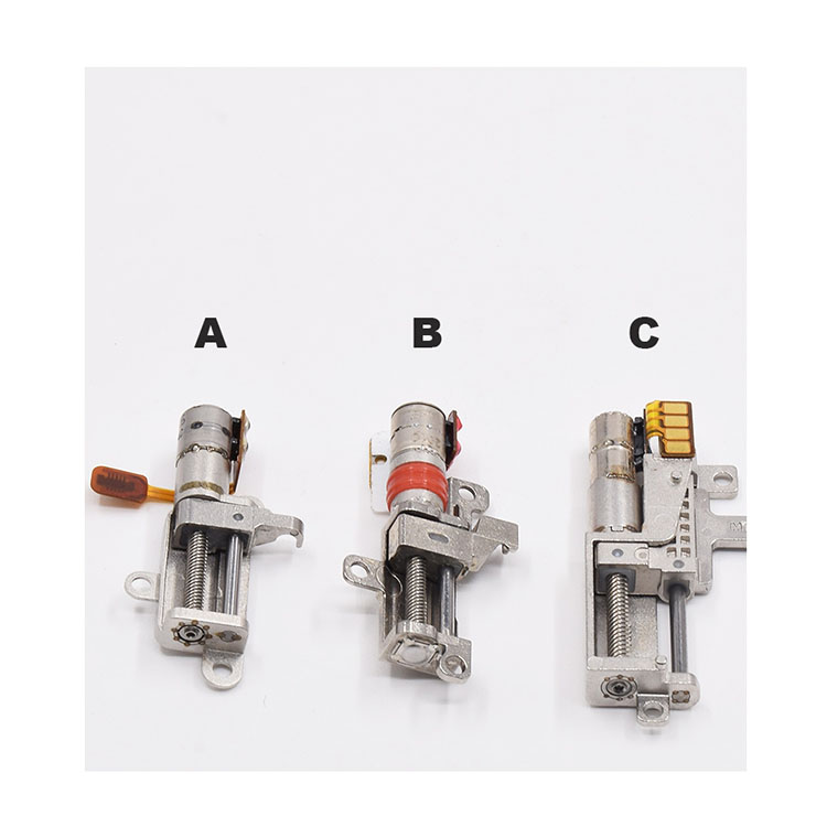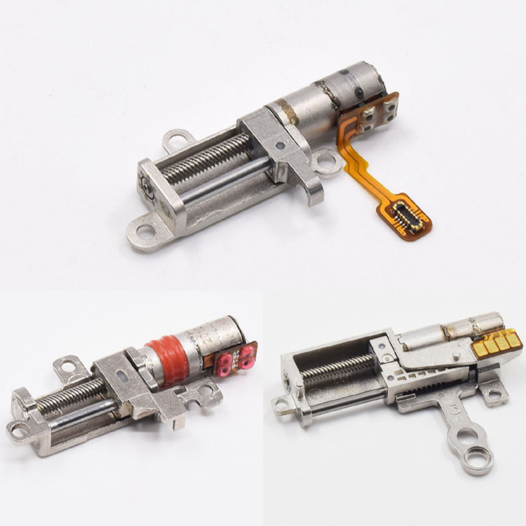 l Miniature two-phase four-wire 5MM stepper motor with planetary gearbox, the planetary gearbox adopts all-metal structure, including metal outer wall and two-stage metal gears, and then drives the precision oblique bad division rod, pushing the metal slider up and down, the bracket is also all metal construction, and the division rod with super miniature precision ball bearings, which is estimated to be the high-end cell phone's telescopic lens adjustment motor