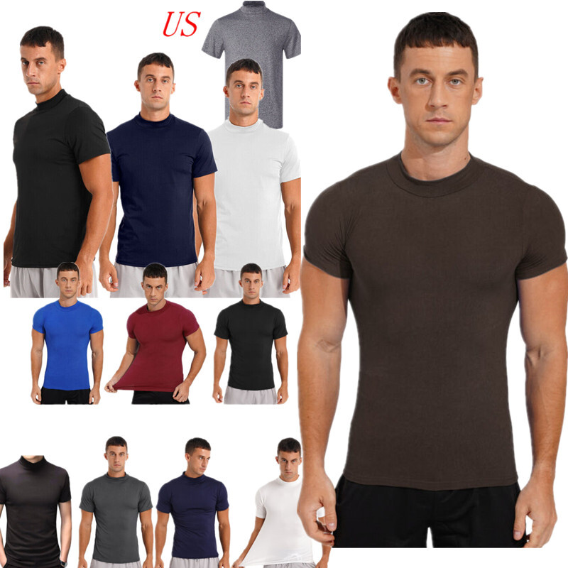 Mens Fashion Mock Neck Short Sleeve T-shirt Casual Solid Color Slim Fit Tops Undershirt.