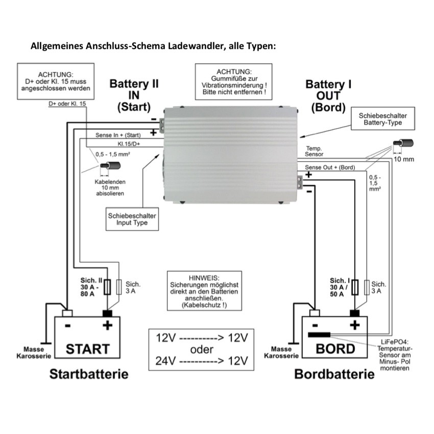 Im Gegensatz zum herkömmlichen Trennrelais, wird die Ladespannung nach Ladeprogramm-Vorgabe abgesenkt oder angehoben, daher besonders gut für EURO-Norm 6, 6 + plus-Fahrzeuge geeignet. Außerdem hat er einen Anschluss für einen Batterie-Temperatur-Sensor (im Lieferumfang enthalten). Im Vergleich zum vorherigen Modell (3306) besitzt der Ladewandler nun größere Anschlussklemmen.