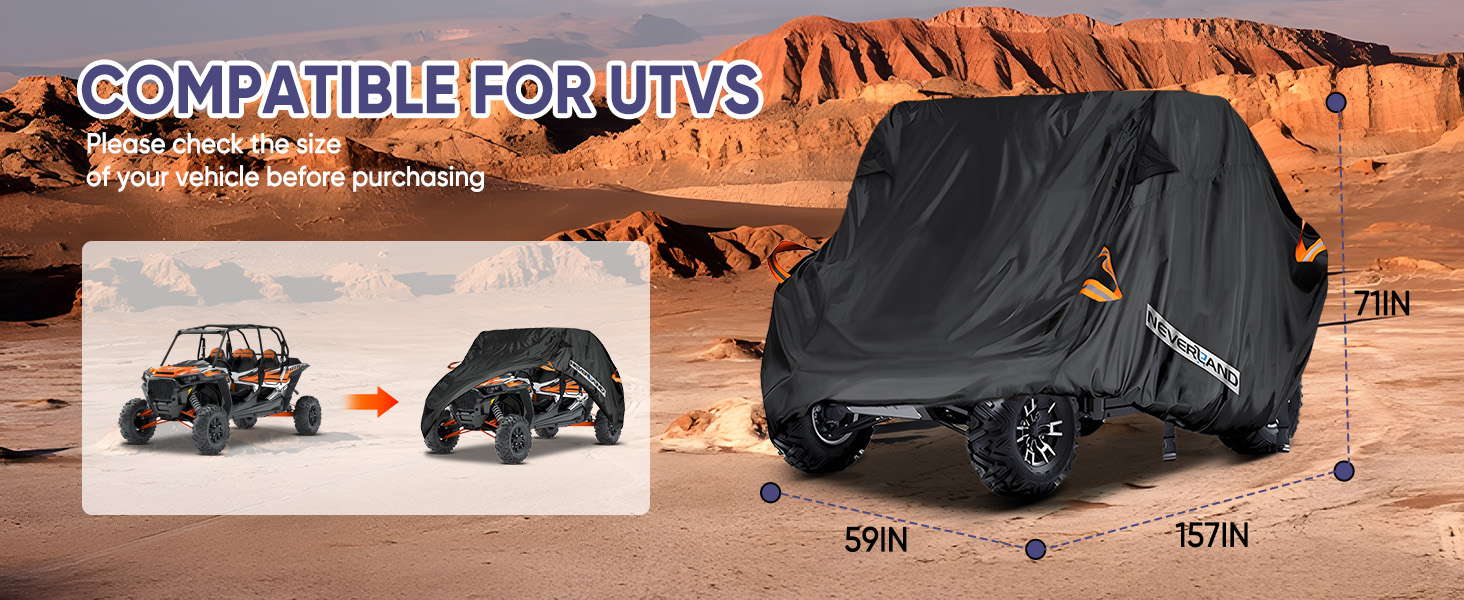 【Storage Bag & Included 】- NEVERLAND Storage Bag, for easy storage when your cover is not in use. Included: UTV Cover, NEVERLAND Storage Bag, 3x Bandage, 3x Plastic Snaps in cover ,2x Alternate Plastic Snaps.