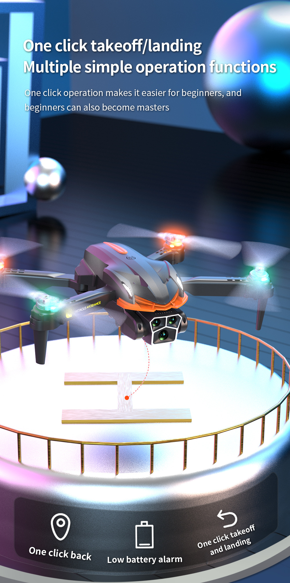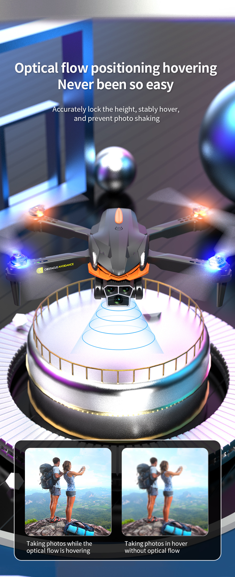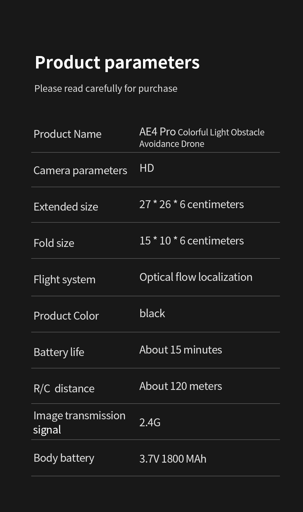 Features: - With intelligent 4-way obstacle avoidance - With foldable arms, small size, easy to carry. - With Optical flow altitude hold mode function provides stable flight. - With wifi function can be connected APP, APK system to take pictures, video, real-time transmission through the phone camera image. - With wide angle camera give wide high denfinition pictures and video. - With Headless Mode, no need to adjust the position of aircraft before flying . - With One key to return function makes it easily to find the way home. - Trajectory Flight. Draw a fligh way on the screen, and the drone would conduct an autonomous flight along the designated way. - 2.4GHz Technology Adopted for Anti-Interference. - 4 Channel which can do ascend, descend, forward, backward, left sideward fly, right sideward fly and rolling 360°. - 6-a-xis g-yro which can have more stable flying and be easy to control. - It have 3-level flight speed to switch that can make more fun with the flying. - The quadcopter fuselage is made of high strength and resistant engineering plastics,lightweight and durable resistance. Function: Proportion colorful light, remote control electrical camera, Optical flow Altitude Hold, intelligent 4-way obstacle avoidance, dual camera switching, 360 ° rolling, gesture photography, video, trajectory flight Up/down, Forward/backward, Turn left/right, Sideward flight, 3-level flight speed, LED Light, Headless Mode, One Key Automatic Return, Altitude Hold Mode, WiFi FPV, Camera/Video Specification: Frequency: 2.4G Channel: 4CH Gyroscope: 6-Axis Operation mode: Remote control/APP control Remote control battery: AA battery X 3 (bring your own) Camera Mode: FPV Remote control mode: Left hand throttle Body battery: 3.7V 2000 mah lithium battery Flight time: 12-15 minutes Charging time: 60 minutes Remote control distance: 150 meters away, 30 meters high Wifi transmission distance: about 100 meters Folding size: 10*15*6cm Expand size: 27*26*6cm Package Included: Drone*1 Remote control*1 USB cable*1 Protective cover*4 Screwdriver*1 Spare blade*4 Drone manual*1 APP manual*1 3.7V 2000mAh lithium battery*1/2/3/4 Drone storage box*1 Shipping Policy: We have strong shipping partners, and globally, our packages are expected to arrive in 7-15 days, and in very few areas more than 20 days. Return Policy: If it is confirmed that the product is seriously damaged, we will provide replacement or full refund. If the product parts are damaged, we will issue replacement parts or partial refund depending on the degree of damage. Contact us: If there is any problem with the product, please contact us in time and we will give you a satisfactory solution. thank you |
