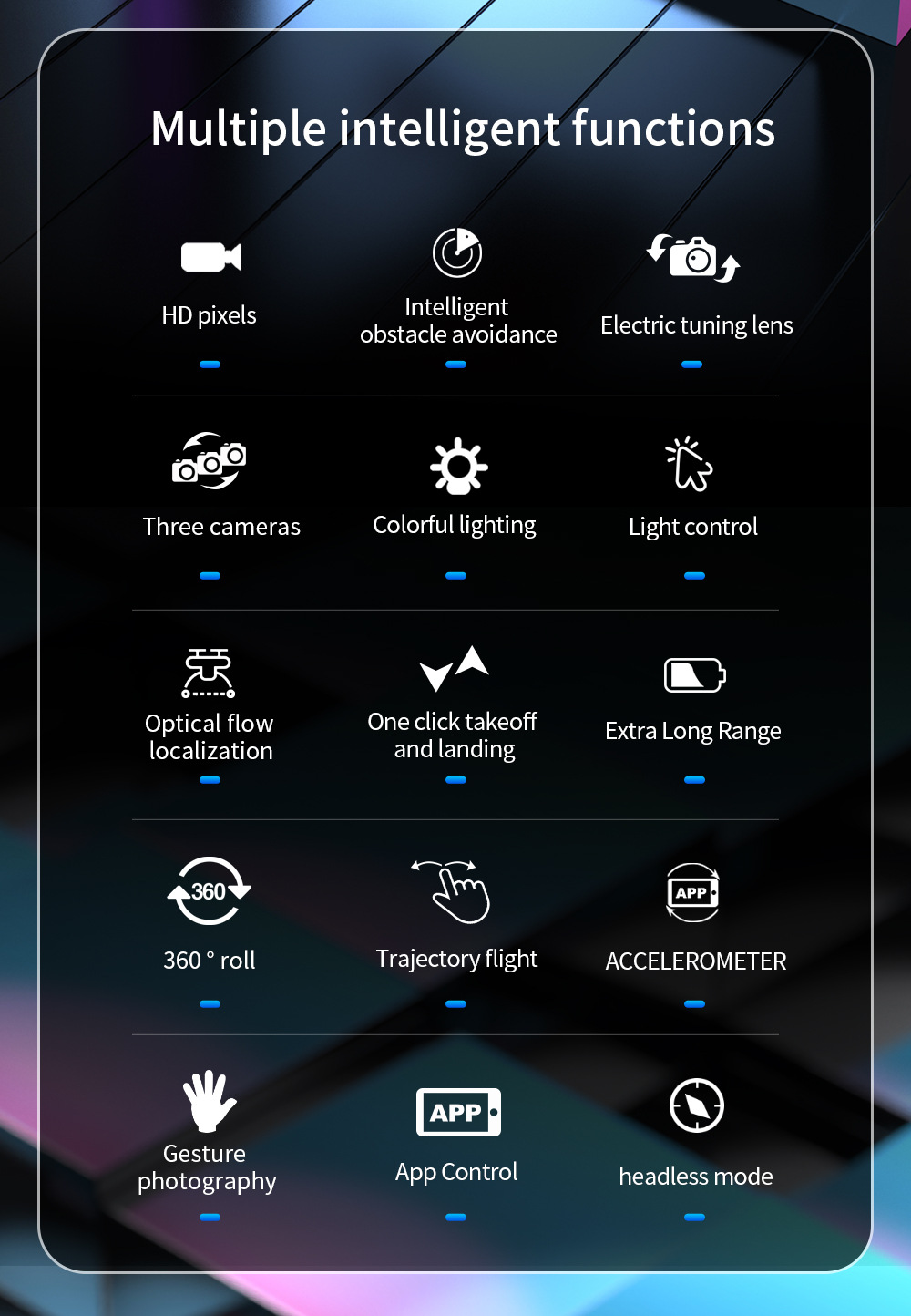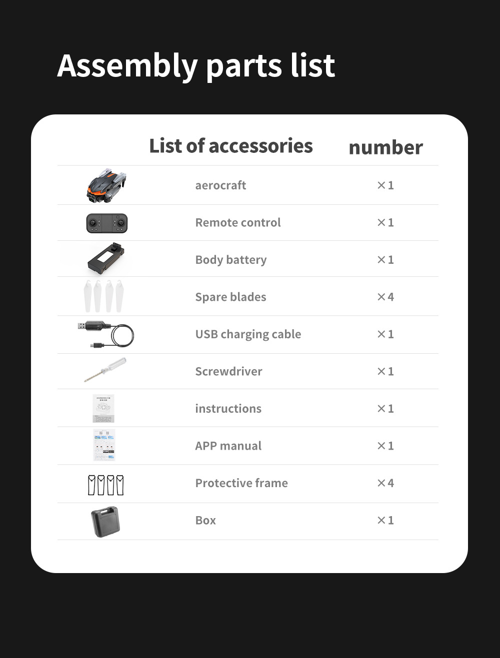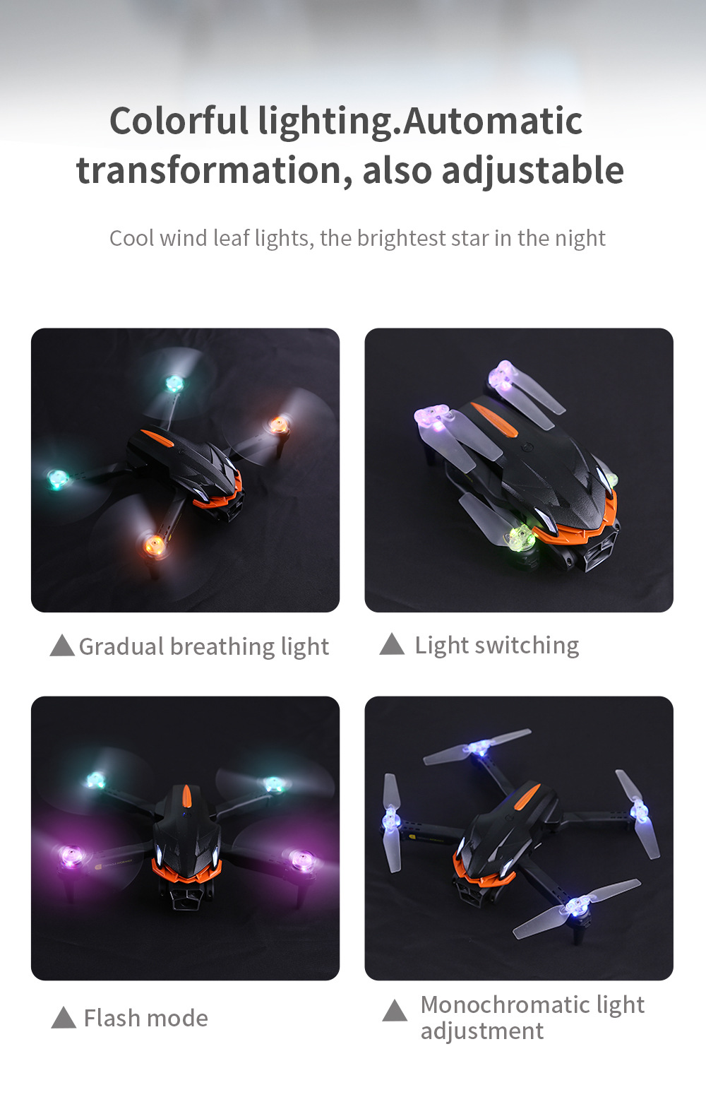 Features: - With intelligent 4-way obstacle avoidance - With foldable arms, small size, easy to carry. - With Optical flow altitude hold mode function provides stable flight. - With wifi function can be connected APP, APK system to take pictures, video, real-time transmission through the phone camera image. - With wide angle camera give wide high denfinition pictures and video. - With Headless Mode, no need to adjust the position of aircraft before flying . - With One key to return function makes it easily to find the way home. - Trajectory Flight. Draw a fligh way on the screen, and the drone would conduct an autonomous flight along the designated way. - 2.4GHz Technology Adopted for Anti-Interference. - 4 Channel which can do ascend, descend, forward, backward, left sideward fly, right sideward fly and rolling 360°. - 6-a-xis g-yro which can have more stable flying and be easy to control. - It have 3-level flight speed to switch that can make more fun with the flying. - The quadcopter fuselage is made of high strength and resistant engineering plastics,lightweight and durable resistance. Function: Proportion colorful light, remote control electrical camera, Optical flow Altitude Hold, intelligent 4-way obstacle avoidance, dual camera switching, 360 ° rolling, gesture photography, video, trajectory flight Up/down, Forward/backward, Turn left/right, Sideward flight, 3-level flight speed, LED Light, Headless Mode, One Key Automatic Return, Altitude Hold Mode, WiFi FPV, Camera/Video Specification: Frequency: 2.4G Channel: 4CH Gyroscope: 6-Axis Operation mode: Remote control/APP control Remote control battery: AA battery X 3 (bring your own) Camera Mode: FPV Remote control mode: Left hand throttle Body battery: 3.7V 2000 mah lithium battery Flight time: 12-15 minutes Charging time: 60 minutes Remote control distance: 150 meters away, 30 meters high Wifi transmission distance: about 100 meters Folding size: 10*15*6cm Expand size: 27*26*6cm Package Included: Drone*1 Remote control*1 USB cable*1 Protective cover*4 Screwdriver*1 Spare blade*4 Drone manual*1 APP manual*1 3.7V 2000mAh lithium battery*1/2/3/4 Drone storage box*1 Shipping Policy: We have strong shipping partners, and globally, our packages are expected to arrive in 7-15 days, and in very few areas more than 20 days. Return Policy: If it is confirmed that the product is seriously damaged, we will provide replacement or full refund. If the product parts are damaged, we will issue replacement parts or partial refund depending on the degree of damage. Contact us: If there is any problem with the product, please contact us in time and we will give you a satisfactory solution. thank you |