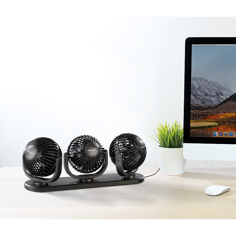 Auch universell einsetzbar: Dank flexibler Stromversorgung per USB, z.B. mit einer Powerbank, ist der Dreifach-Ventilator praktisch überall einsetzbar - ob zu Hause, im Büro oder am Baggersee.