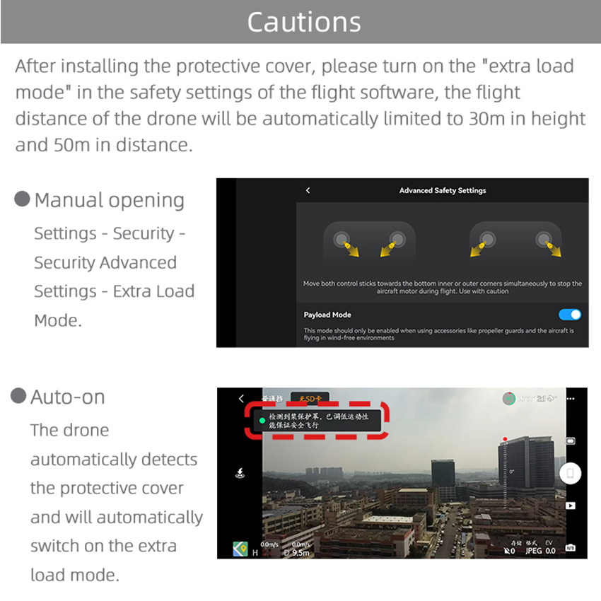 l After installing the protective cover, please turn on the "extra load mode" in the safety settings of the flight software, the flight distance of the drone will be automatically limited to 30 meters in height and 50 meters in distance, please fly carefully.