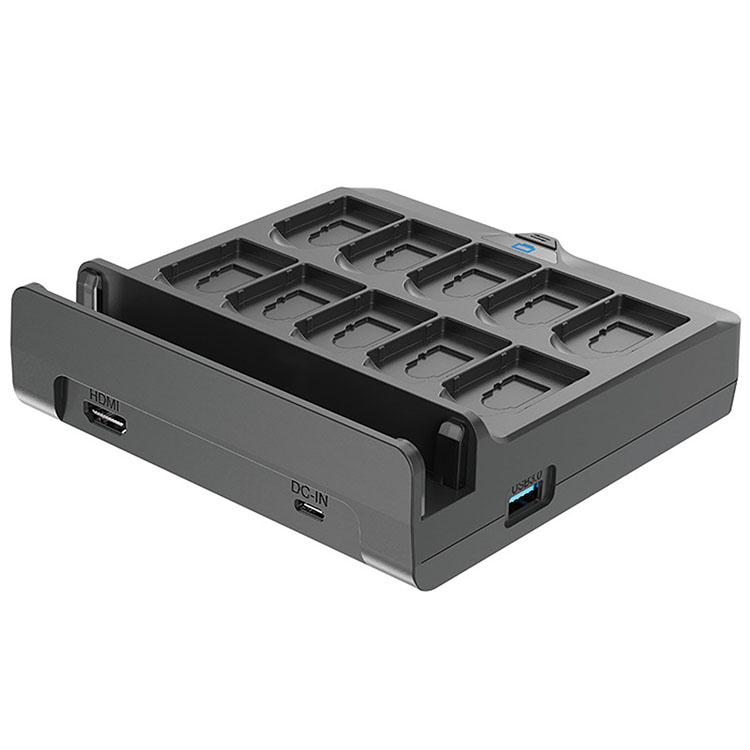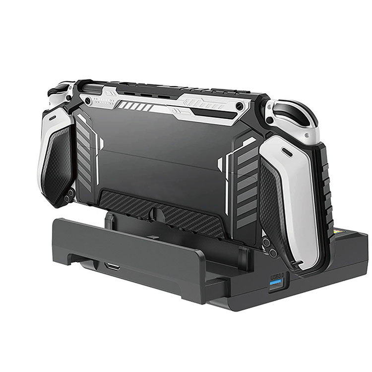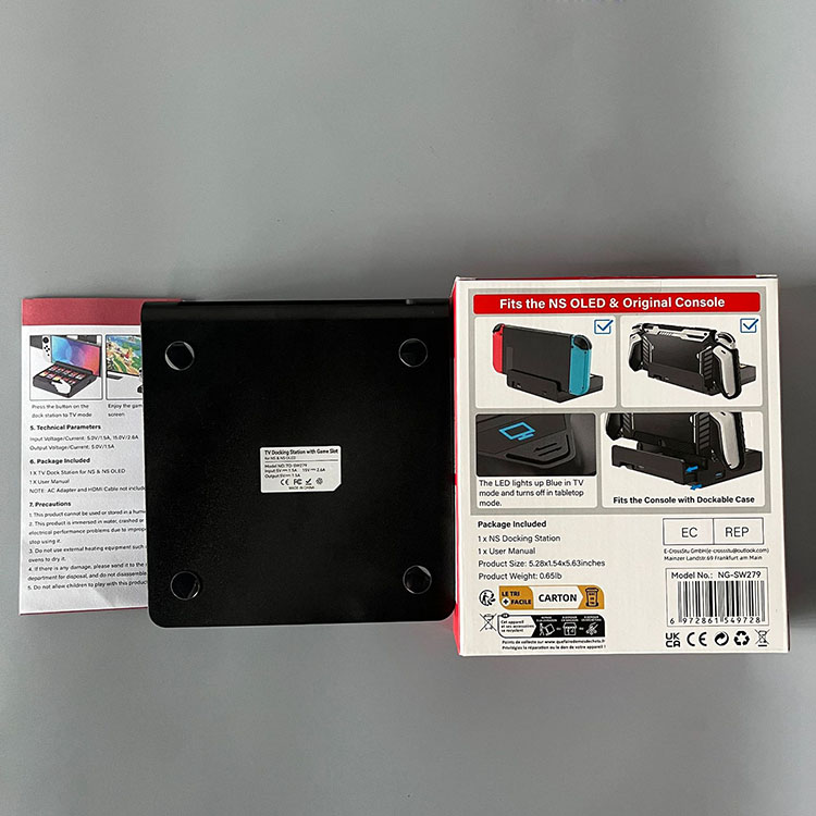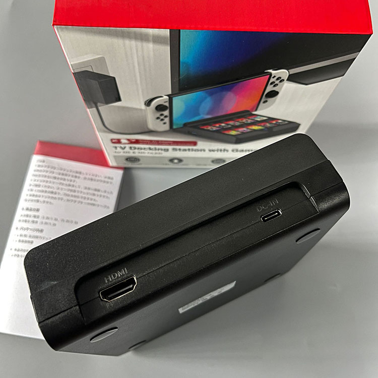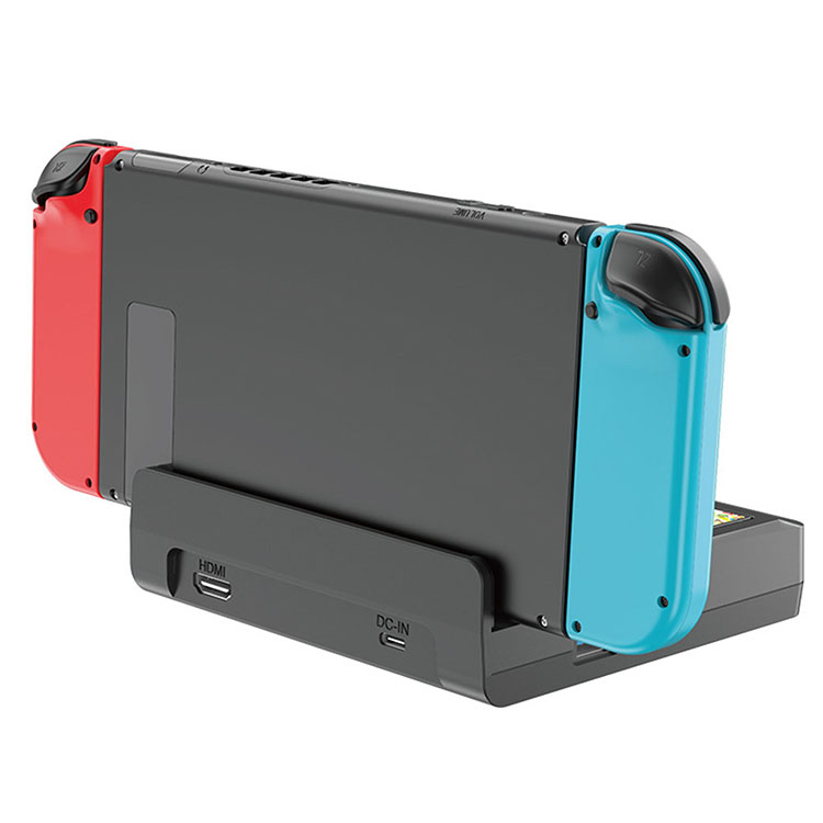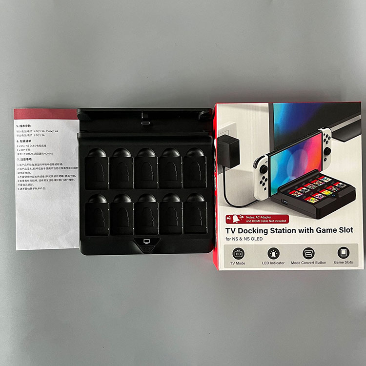 l TV dock for NS and NS OLED consoles with game card slot to store 10 NS game cards and 10 TF cards, powered by original or PD protocol 3rd party adapter (15V/2.6A)