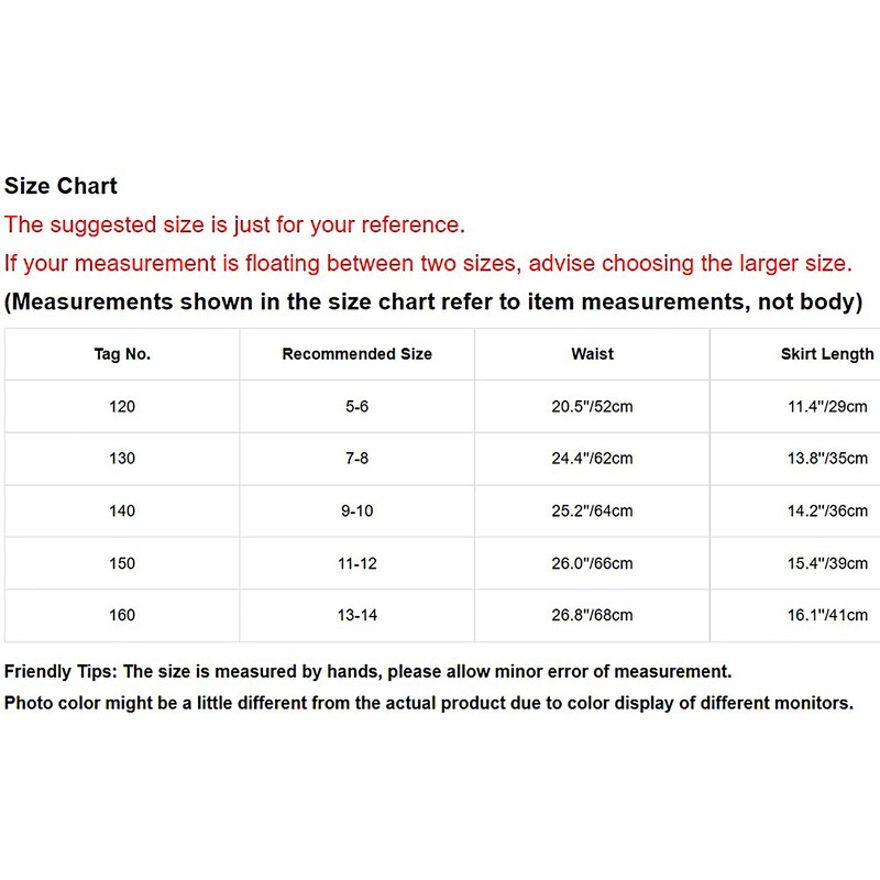| Tag No. | Recommended Size | Waist | Skirt Length |