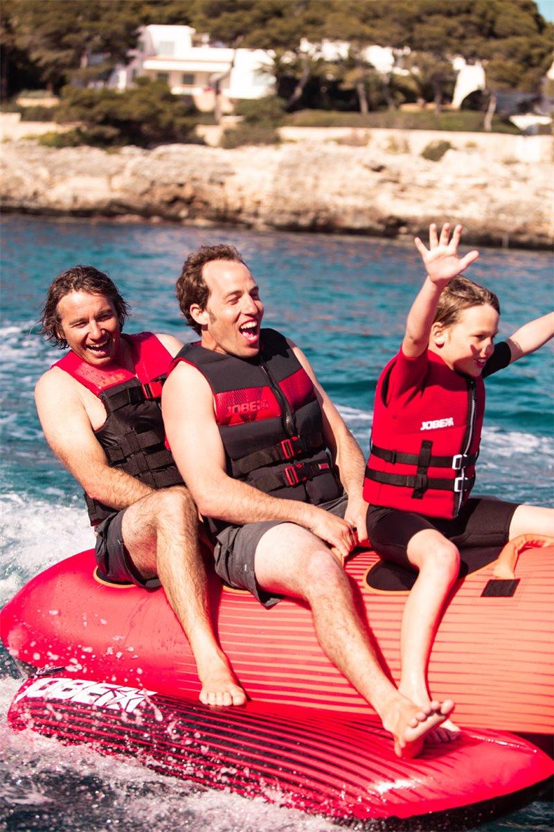 Mit Ventilabdeckungen aus Nylon, Reißverschlussbremse mit PVC Schutzabdeckung für höhere Belastungen sowie Anti-Rutsch-Pads aus Neoprene ausgestattet ist die JOBE CHASER "Banane" ein hochqualitatives Produkt für die ganze Familie und sorgt für jede Menge Spaß auf dem Wasser. Die Tube hat im Boden integrierte Wasserabflüsse (Drainage System - selbsttätig Wasser ablassend) und einen Tube Konnektor (Tube Schnellverbinder), an dem mit einem Handgriff die Leine befestigt oder gewechselt werden kann.