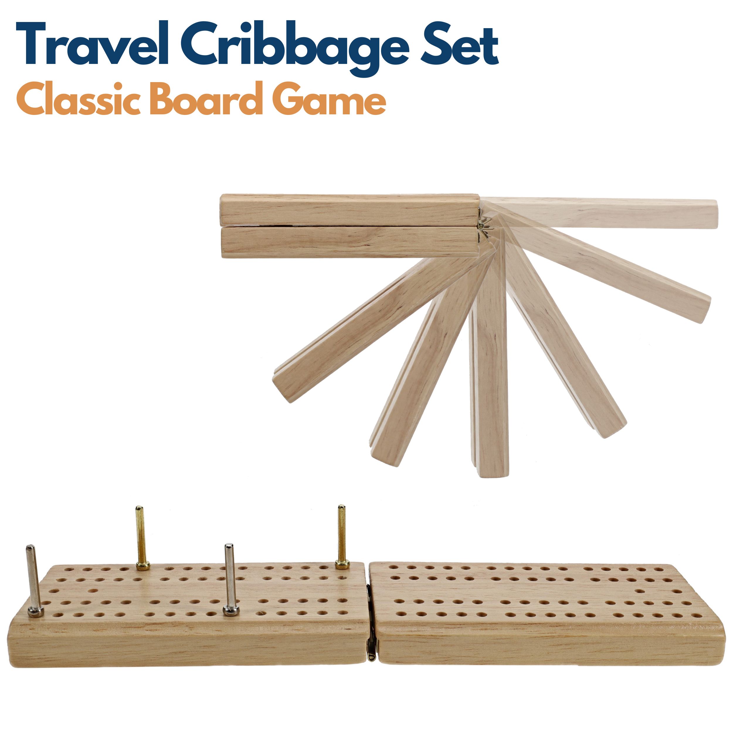 Classic simplicity, wood construction and small design make this a popular little cribbage board for anyone who enjoys playing cribbage on camping trips or while traveling the globe. The cribbage board has two tracks, folds in half, and has a storage space for the metal scoring pegs. Cribbage is a card game distinctly known for the cribbage board, or crib used for scorekeeping. It contains a series of holes known as streets, lanes, or tracks on which the score is tallied with pegs, or spilikens. Points are registered by pegging the score along the cribbage board.