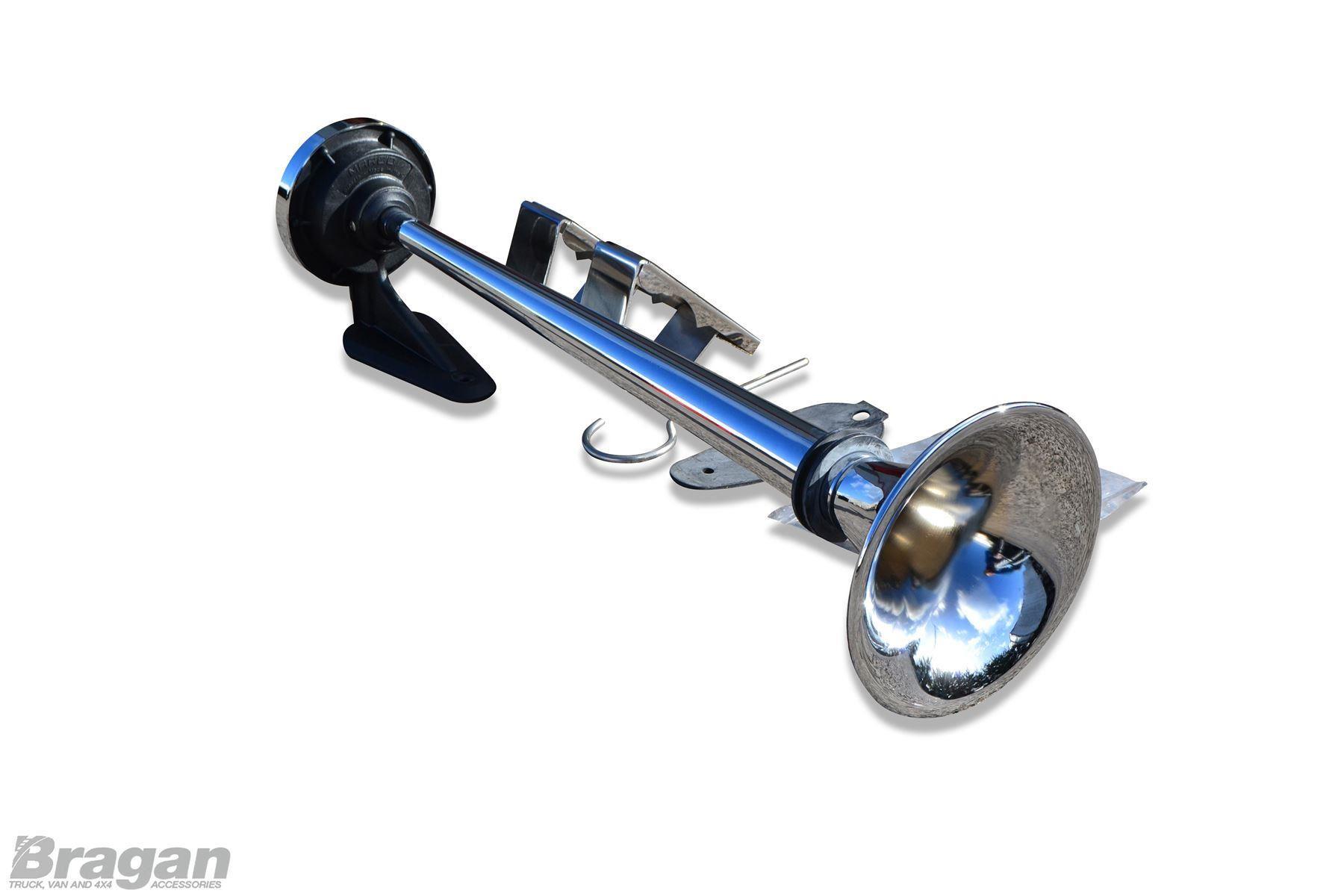 With 2x Single Barrel Trumpet Air Horns (non rusting) made from chrome plated brass for mounting to truck light bars. Can also be mounted directly to a flat surface. This air horn is of high quality and manufactured in Italy, not to be confused with cheaper Chinese products. Comes complete with fixing hardware, excluding control valves.