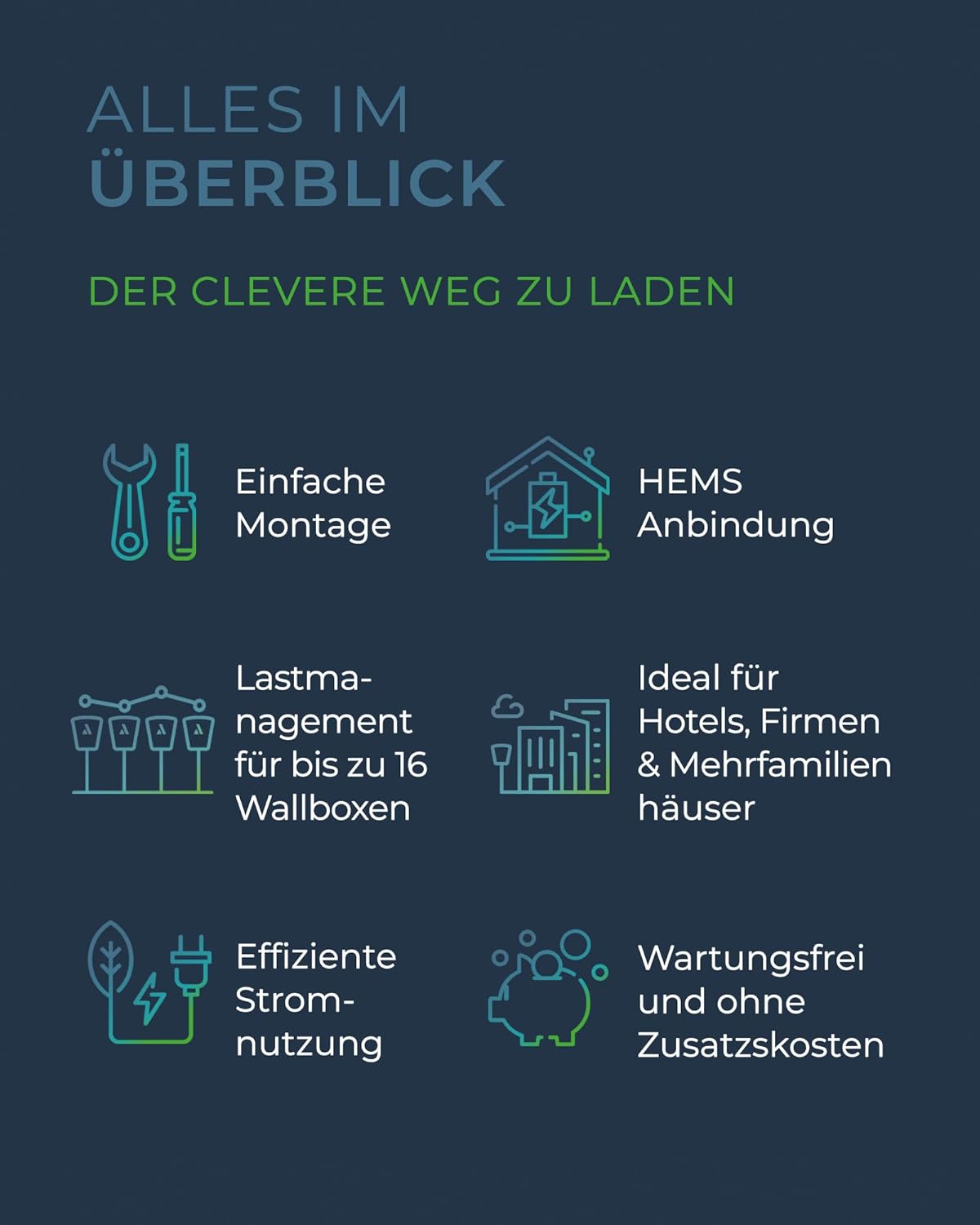 • Smartes Ladesystem für bis zu 16 E-Autos – maximal 16 Wallboxen vernetzbar