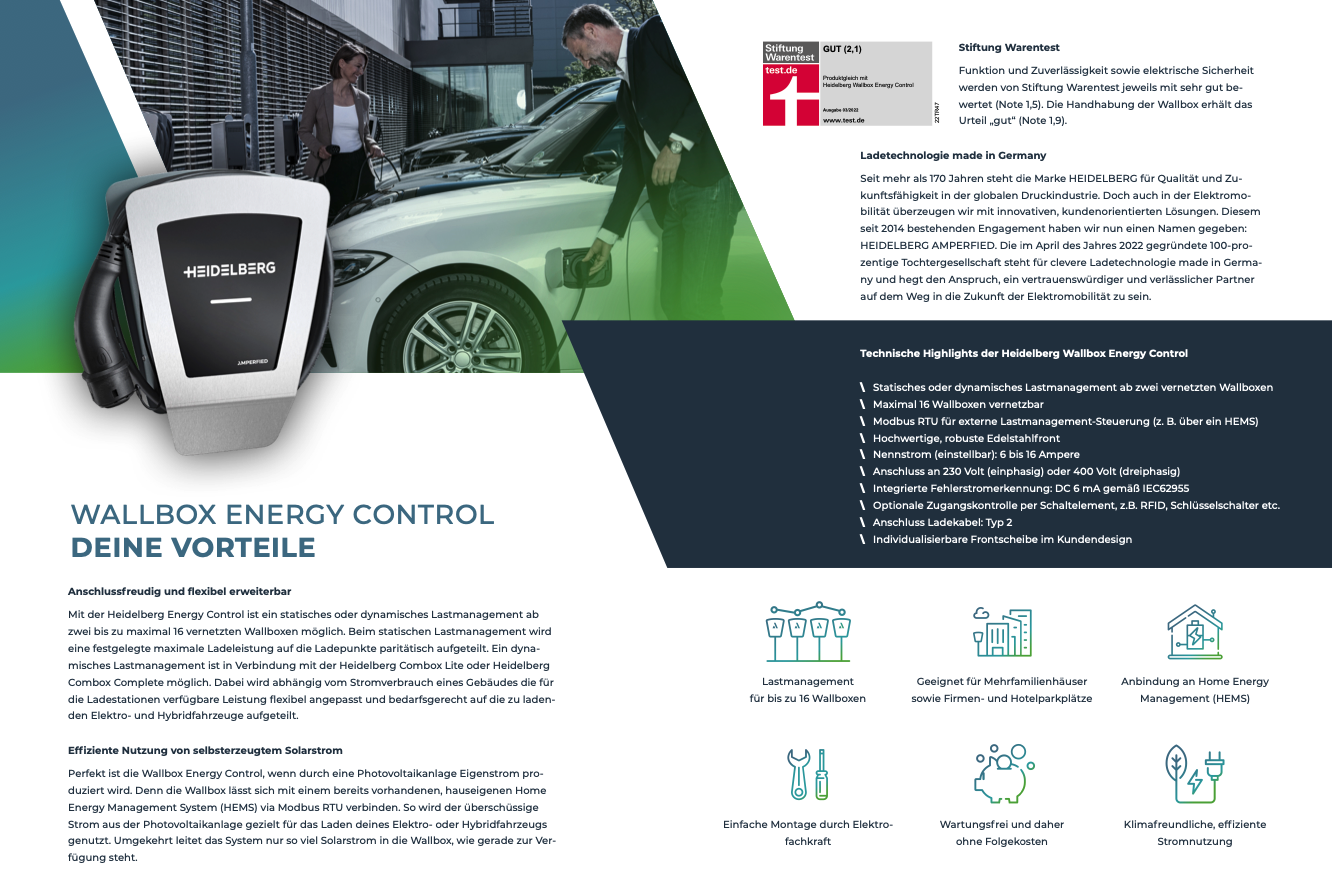 Die Heidelberg Wallbox Energy Control ist die perfekte Ladelösung für Garagen, Mehrfamilienhäuser sowie Firmen- und Hotelparkplätze. Dank lokaldynamischem Lastmanagement verteilen mehrere vernetzte Wallboxen den Ladestrom auf bis zu 16 Hybrid- oder E-Autos. Zudem lässt sich die Wallbox kostengünstig installieren, da sie an jedem Standard-Drehstromanschluss betrieben werden kann. So einfach geht Laden heute.