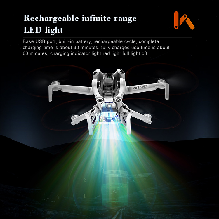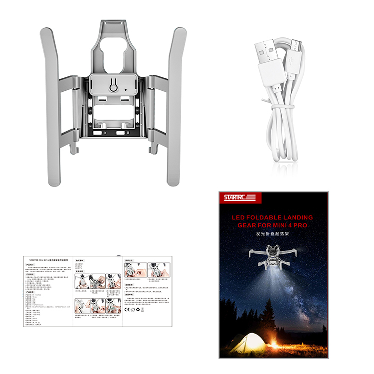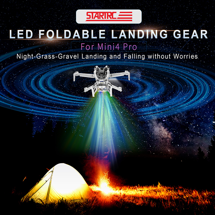 l The lighted kickstand can raise the distance between the bottom of Mini 4 Pro and the ground by 20mm, when Mini 4 Pro is either at night or on an overgrown, rugged gravel road, it can reduce the impact force, make the drone land smoothly, prevent ground debris or water stains from dirtying or damaging the drone fuselage, gimbal, sensors, and propellers, and provide a safe landing protection
