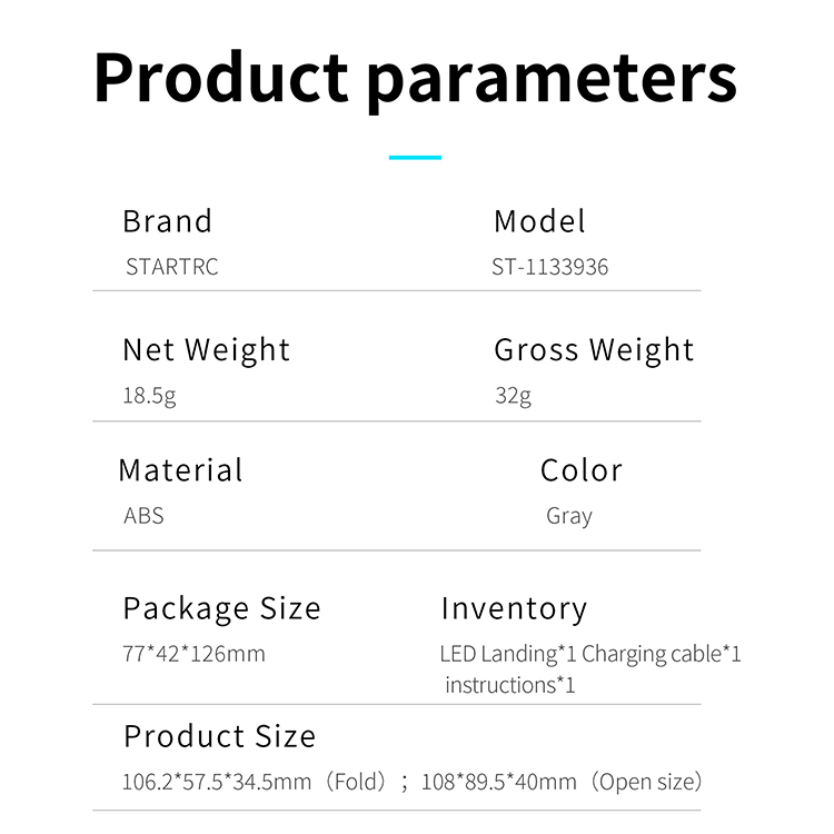 l Lightweight design, luminous tripod weighs only 18.5 grams, can stably carry the fuselage, lightweight design will not add extra burden to the Mini 4 Pro flight, will not shake or fall off during the flight.