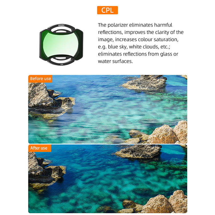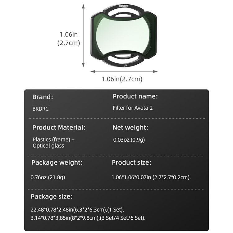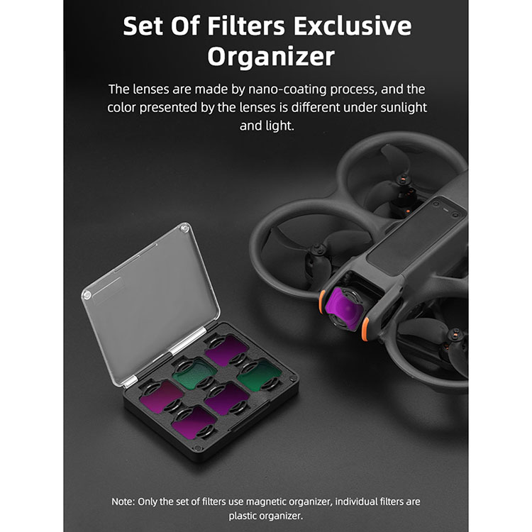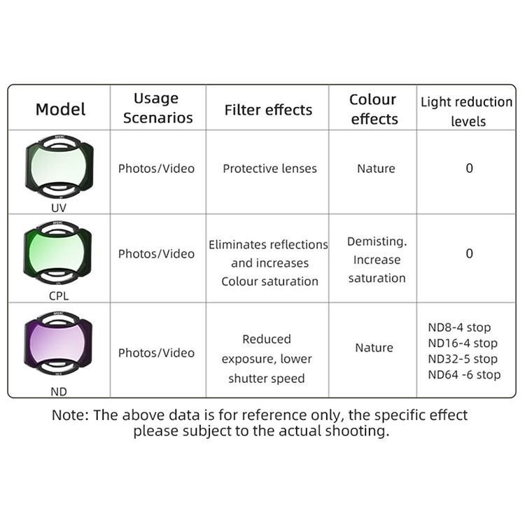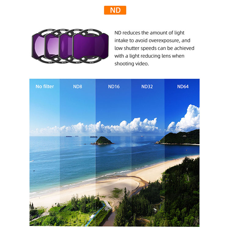 l Types (Optional): Filter UV, Filter CPL, Filter ND8, Filter ND16, Filter ND32, Filter 3-piece Set (UV+CPL+ND16), Filter Official 3-piece Set (ND8+ND16+ND32), Filter 4-piece Set (ND8+ND16+ND32+ND64), Filter 6-piece Set (UV+CPL+ND8/16/32/64)