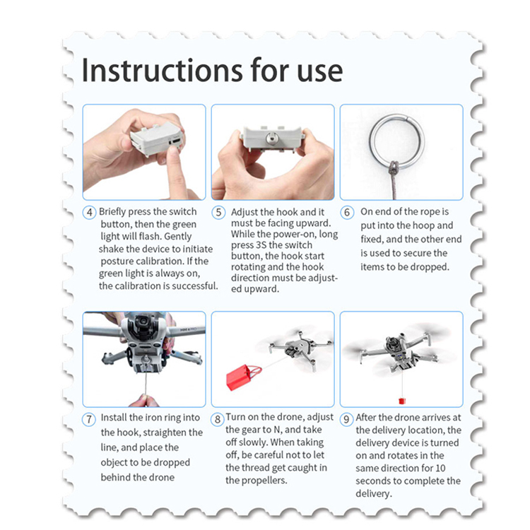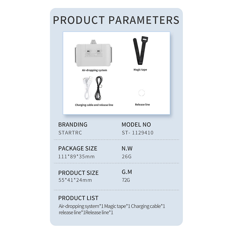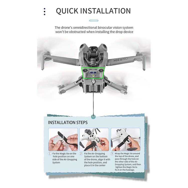 l Easy to install and disassemble, fixed on the fuselage by the lanyard, there is a card position fixed on the dispenser, it will not shake loose and will not block the visual positioning sensor of the drone, the weight of the dispenser is about 25g, which will not affect the flight of the drone