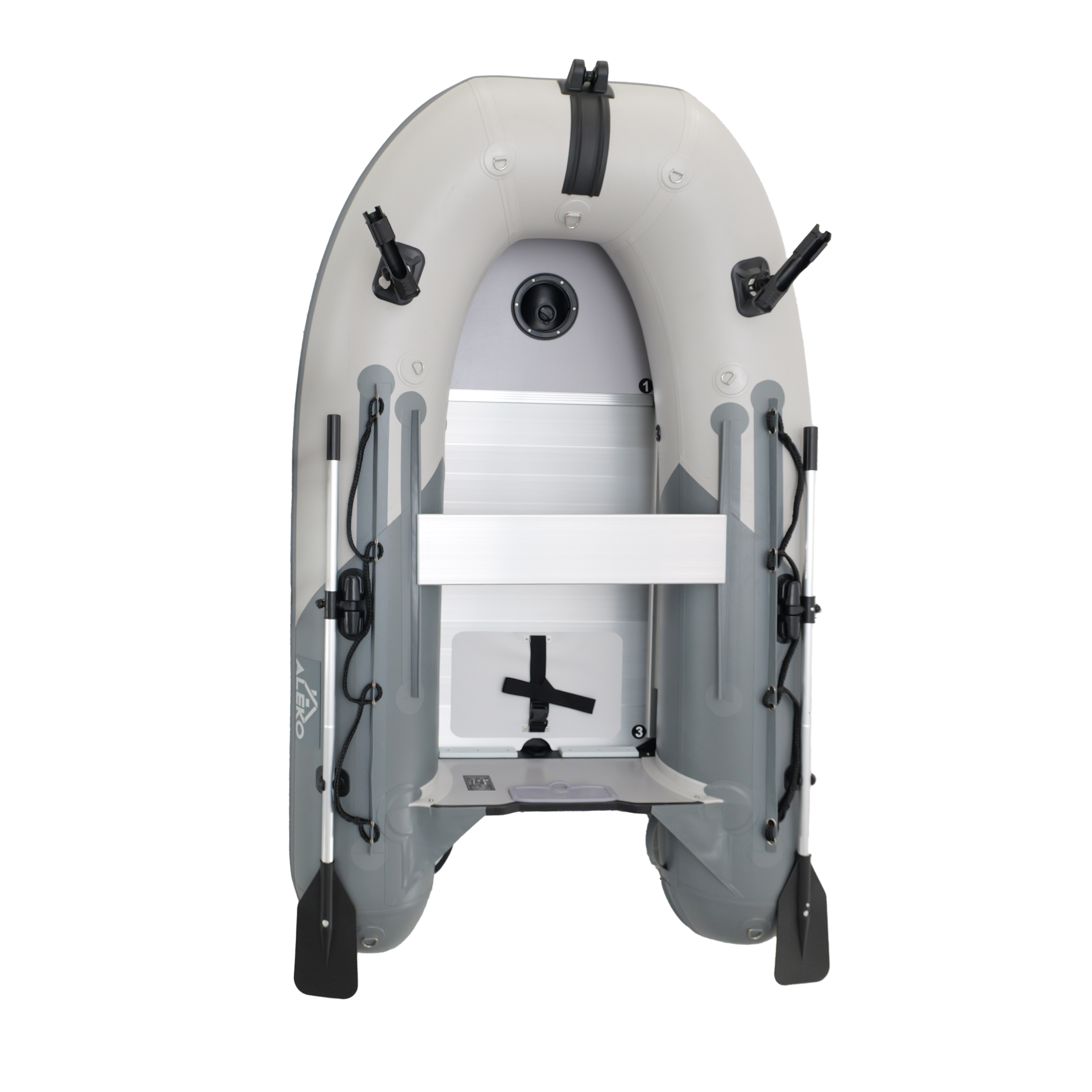 Description: Features: Aluminum floor, 1 aluminum bench, 2 aluminum oars 3 separate air chambers Four 360-degree adjustable fishing rod holders Deep inflatable V-keel for better maneuverability and speed 7.8-inch width rubber strake for added protection Rounded stern tubes for more buoyancy Triangular splash guards with grab rope Straps to tie down gas tank and battery box Rear transom with one-way drain plug Motor Capacity: 8 HP; 6kW Towing D-rings and front lifting handle 4 D-rings for attaching bow bag (bow bag not included) Anchor rope slide / 4 soft rear handles Safety valve / Keel valve cover Floor, Bench, and Oar Material: Aluminum Boat Material: 2000 Denier 1.2mm PVC; Double-layer PVC on bottom Weight Capacity: 770 lbs. / Seating Capacity: 3 People Exterior Dimensions: 8.25L x 5W x 1.87H ft. Interior Dimensions: 5.25L x 2.25W ft. Bench Length: 33.46 in. Boat Weight: 117 lbs. Color: Light and Dark Gray Kit Includes: (1) Inflatable Boat; (1) Hull; (2) Oars; (1) Aluminum Bench; (1) Set of Aluminum Floorboard; (1) Floorboard Storage Bag; (4) Fishing Rod Holders; (1) Carry Bag; (1) Foot Pump; (1) Repair Kit; (1) Manual; (1) Registration Document