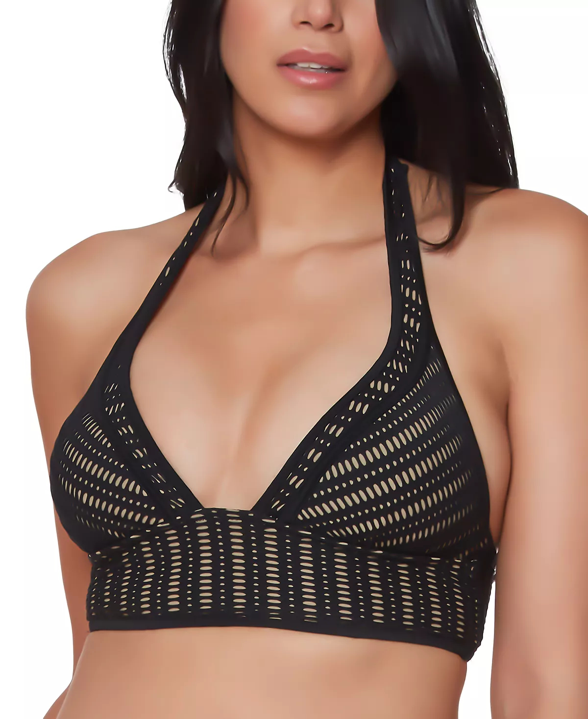 Spice things up with this fresh look from Bar III, a bikini top with a deep neckline and airy crochet.