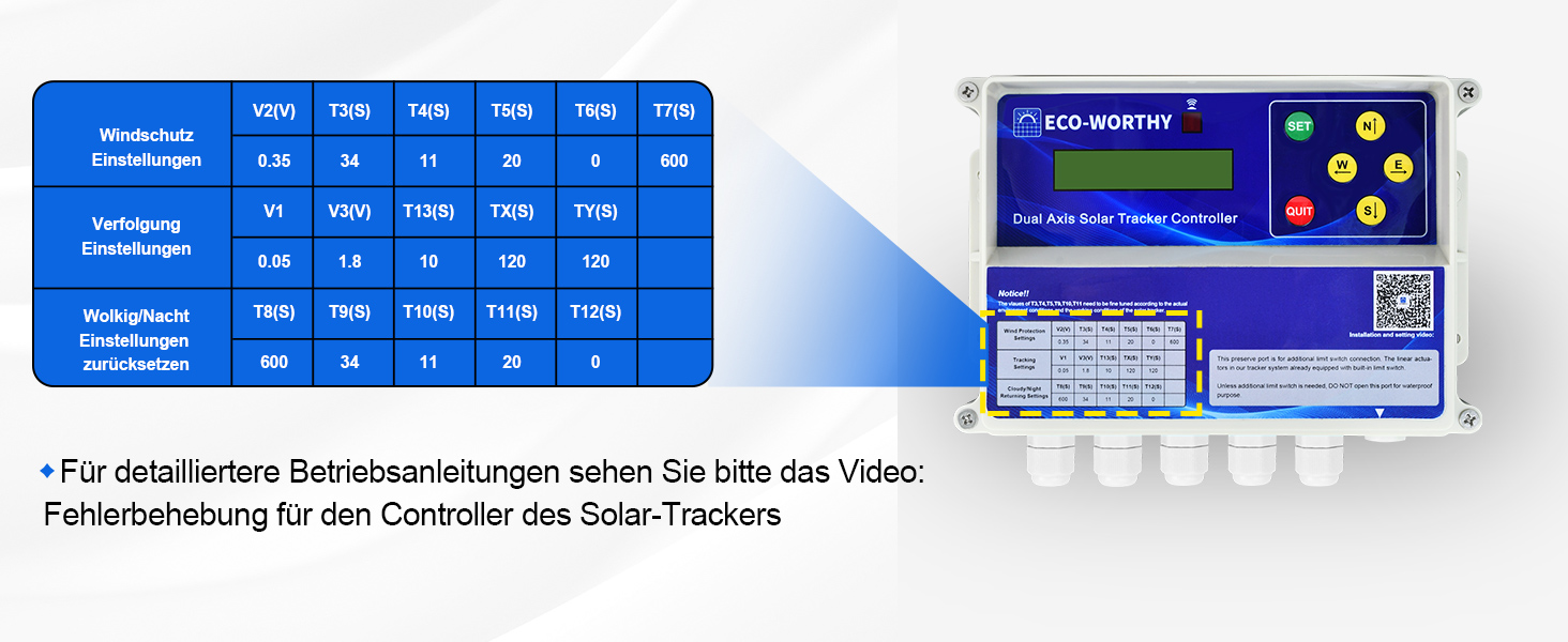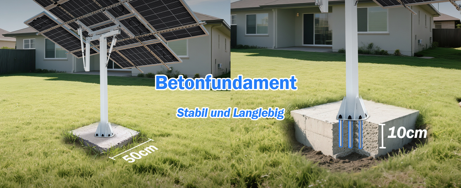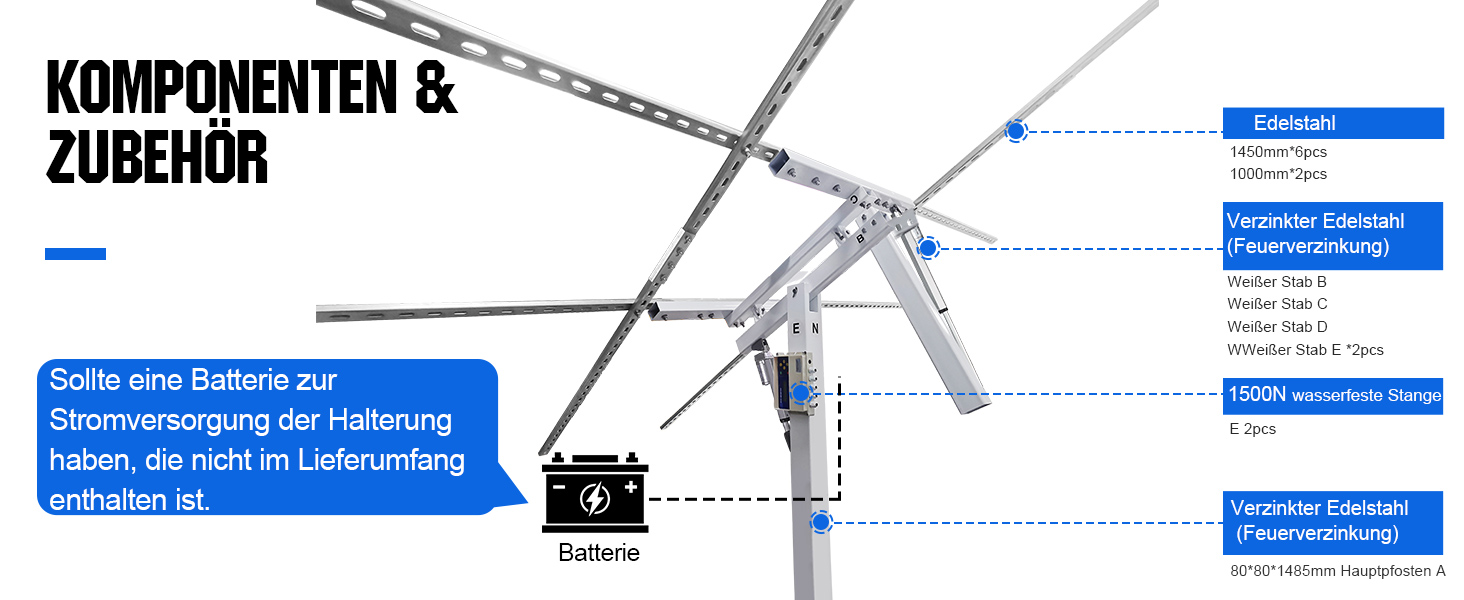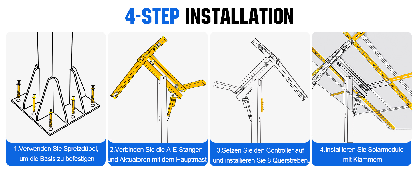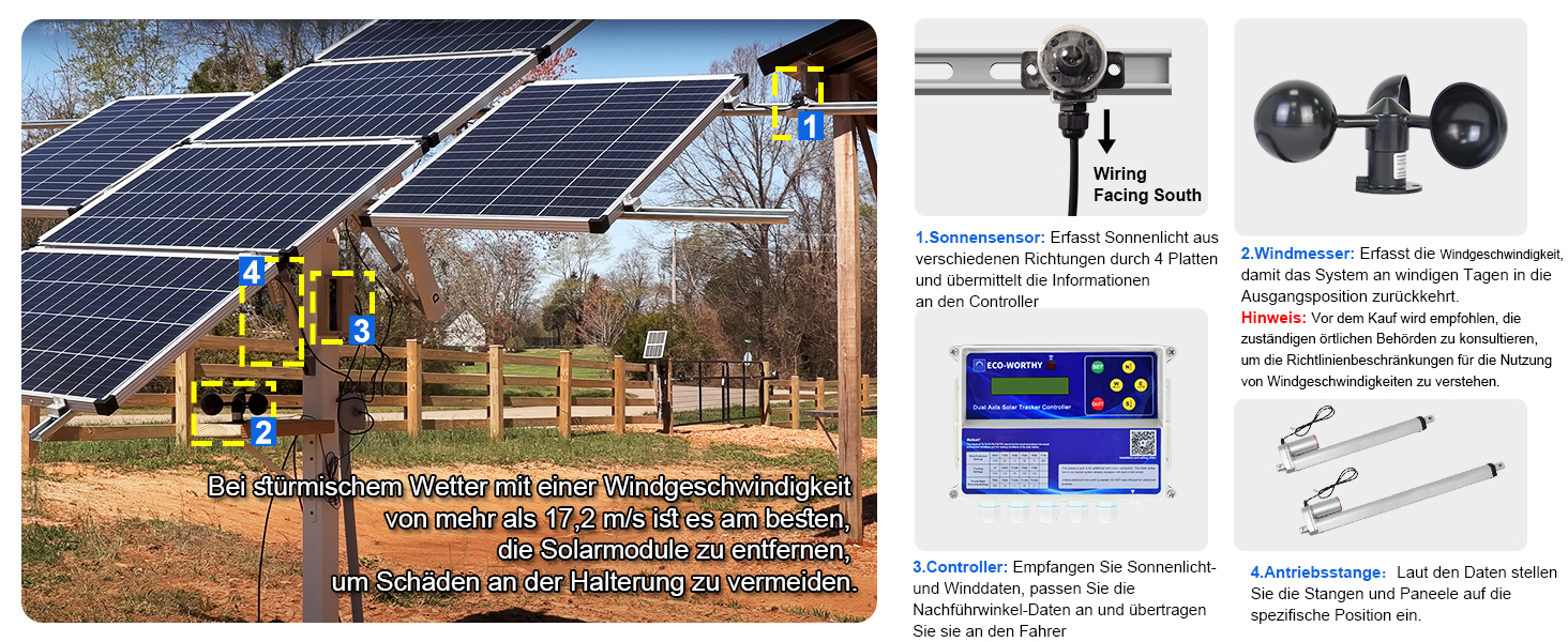 Es gibt einen Luftgeschwindigkeitssensor für windige Tage, wenn er starken Wind erkennt (Daten können manuell eingestellt werden), setzt der Solartracker den Winkel zum Horizont automatisch zurück, um stabil zu bleiben. Durch das Bohren der Spreizschrauben in den Boden kann der Sockel auch bei Hurrikan oder Sturm problemlos fest stehen.(Hinweis:Bei stürmischem Wetter mit Windgeschwindigkeiten von mehr als 17,2 m/s ist es ratsam, die Solarmodule zu entfernen.)