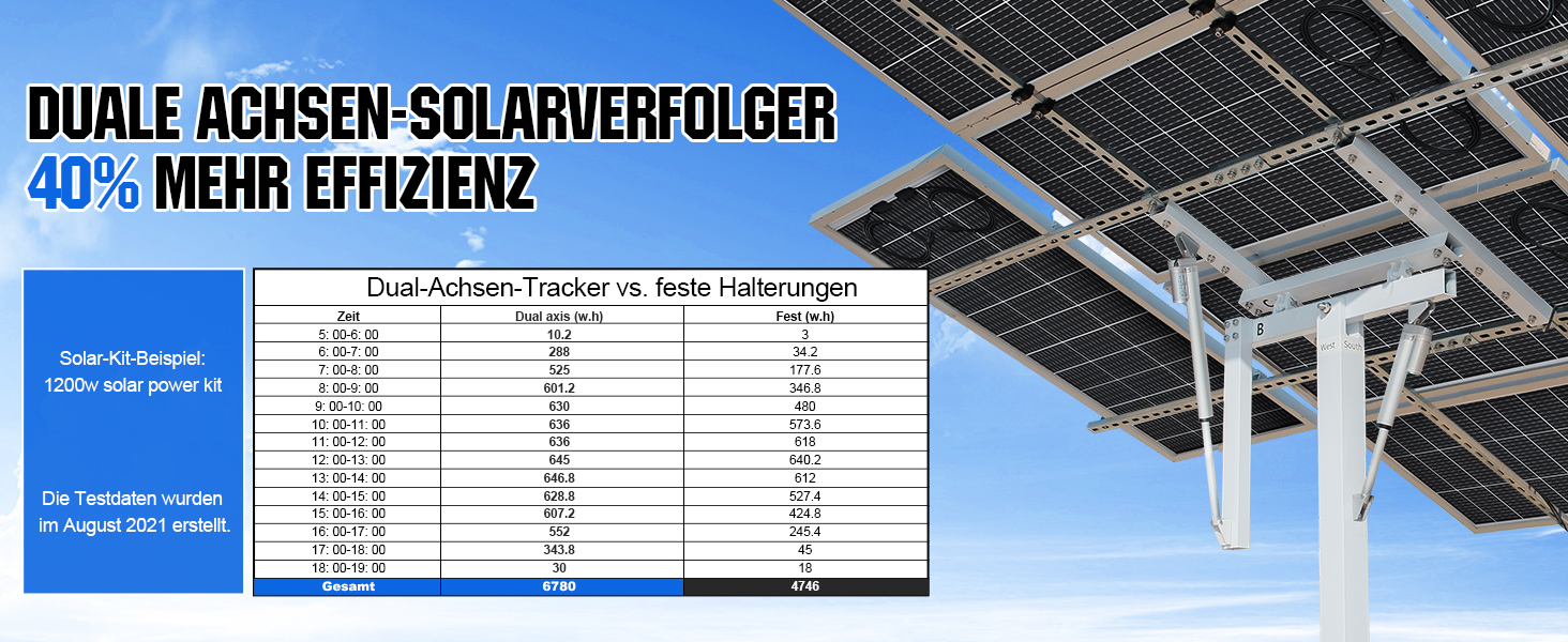 Mit 2-Achsen-Antrieb und empfindlichem Sonnenscheinsensor kann sich der Solartracker um 270 ° drehen und die Paneele so gestalten, dass sie die Sonneneinstrahlung von der Nord-, Süd-, West- und Ostseite absorbieren.