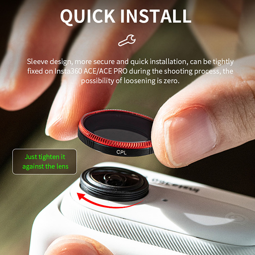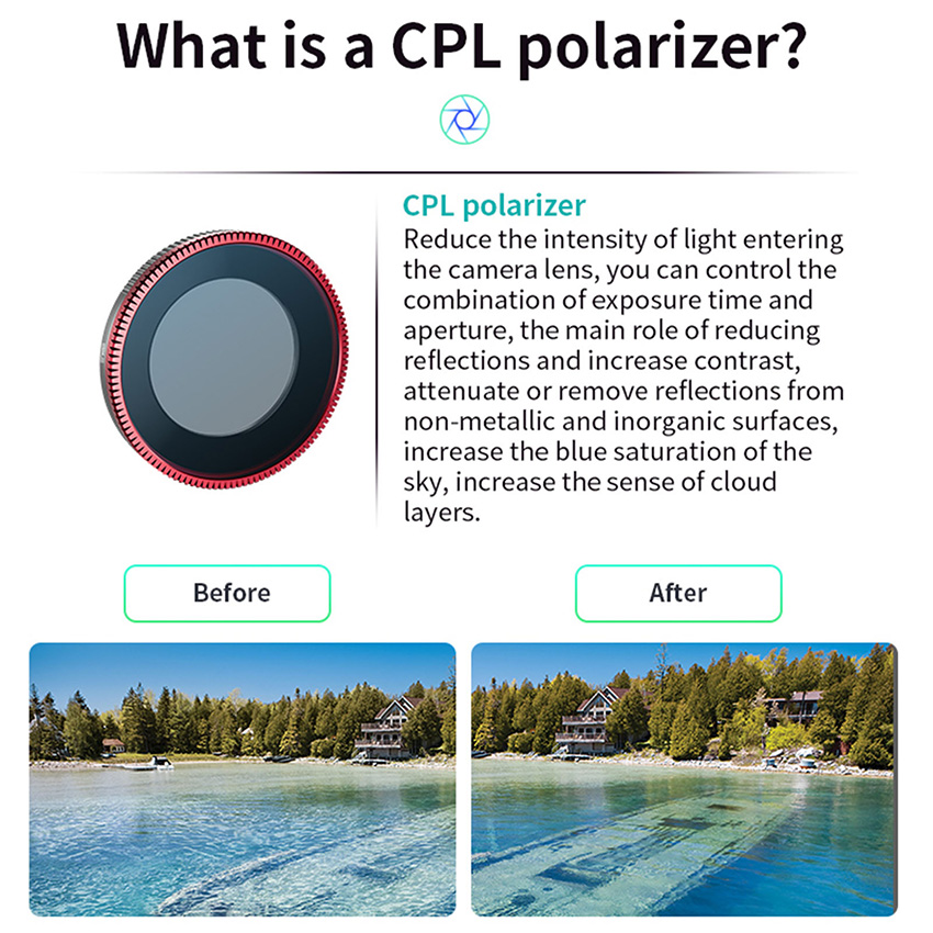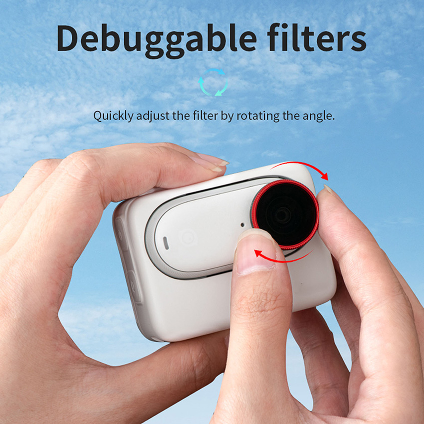l Customized CPL filter for insta360 GO3S with multi-layer coating, waterproof, anti-scratch, dust-proof and oil-proof, protects your GO3S lens from all-round damage. It can eliminate reflections from non-metallic surfaces, such as glass and water, and is often used to photograph scenes behind glass, clear and transparent water, and underwater creatures, etc. It also enhances color and contrast, making the sky bluer and the water clearer, especially suitable for white cloud and blue sky photography