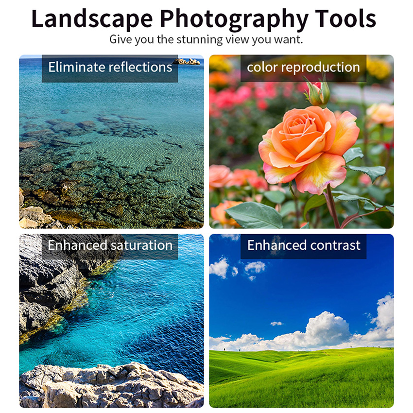 l Each filter is made of high-definition optical glass, which has no effect on the image quality, and has been ground and polished many times to form a low refractive index, which ensures the true color reproduction of the image for color-accurate photo shooting