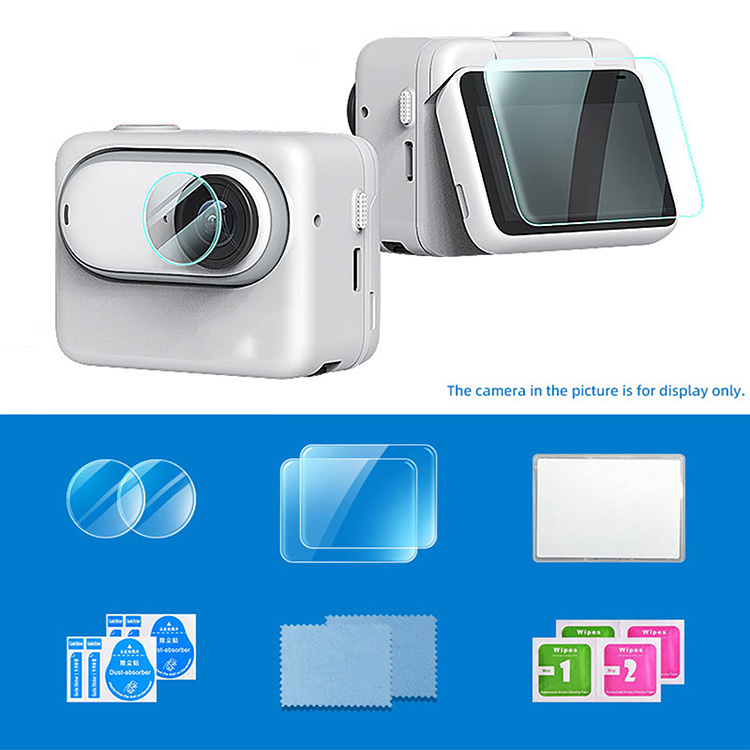 l 1x Tempered Glass Lens Protector, 1x Tempered Glass Screen Protector, 1x Wet and Dry Screen Cleaning Paper, 1x Dust-absorber, 1x Lens-wiping Cloth, 1x Protection Box