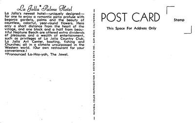 LA JOLLA PALMS HOTEL La Jolla, California San Diego Vintage Postcard ca 1940s