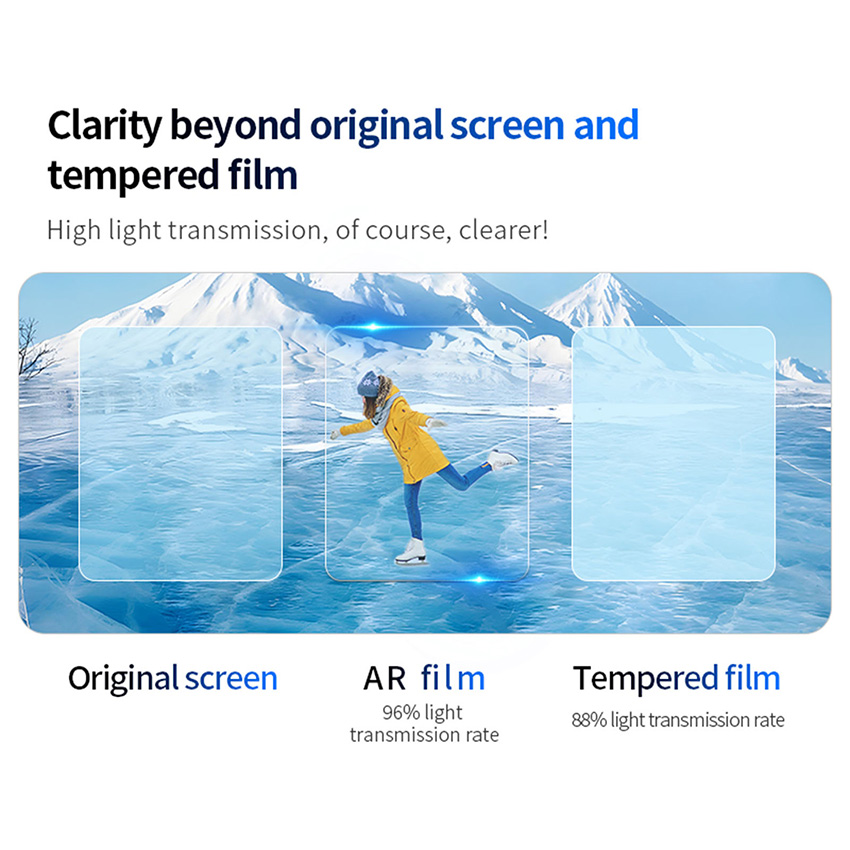 l After pasting the AR transmittance enhancement film, whether indoors or outdoors, can reduce the light source albedo, improve the screen transmittance, even if you read the screen under the light, you can also be able to watch clearly, you can save the power to adjust the brightness, comfortable to use