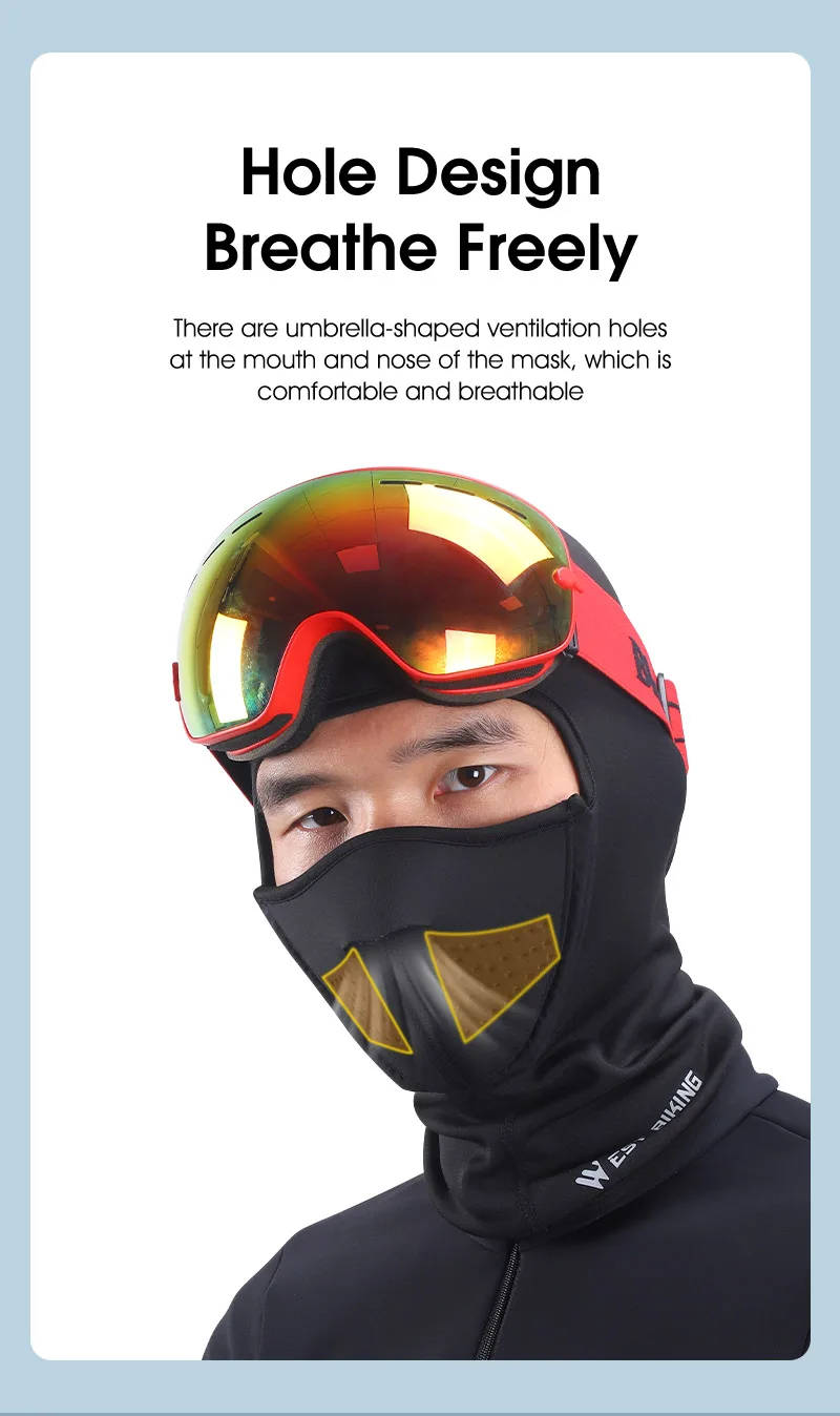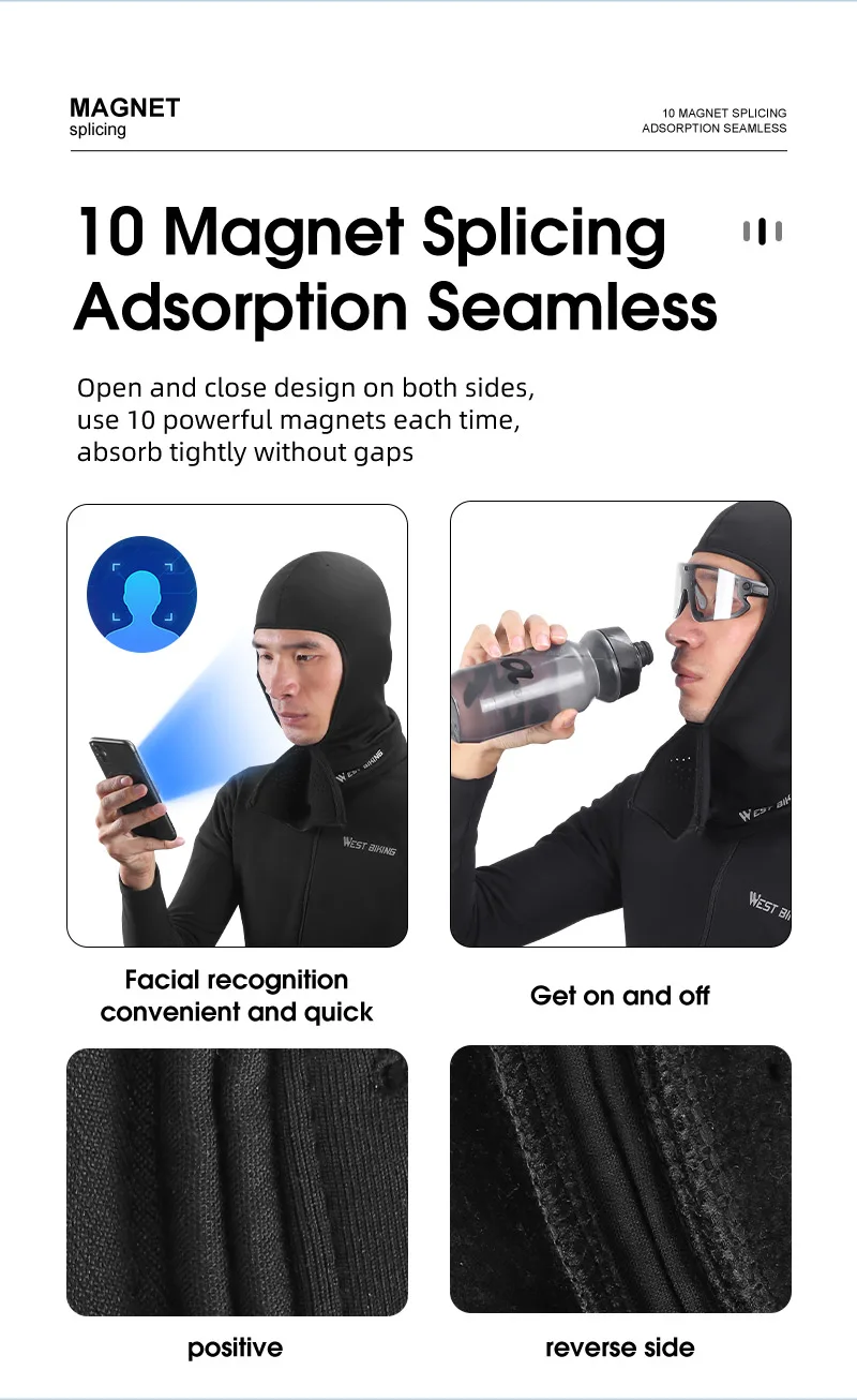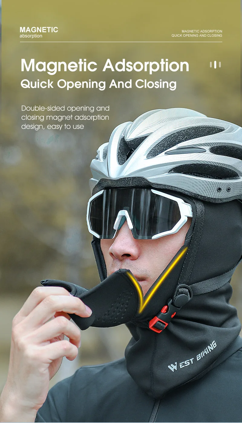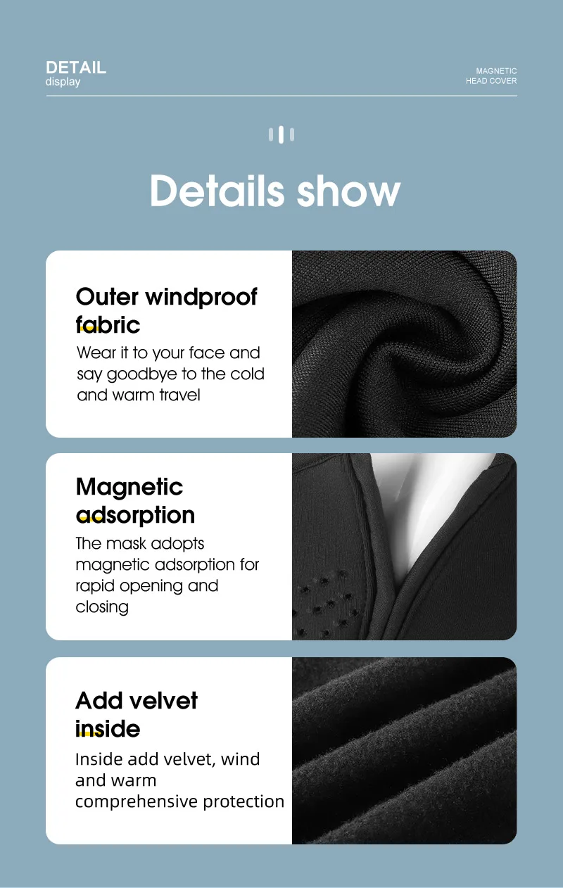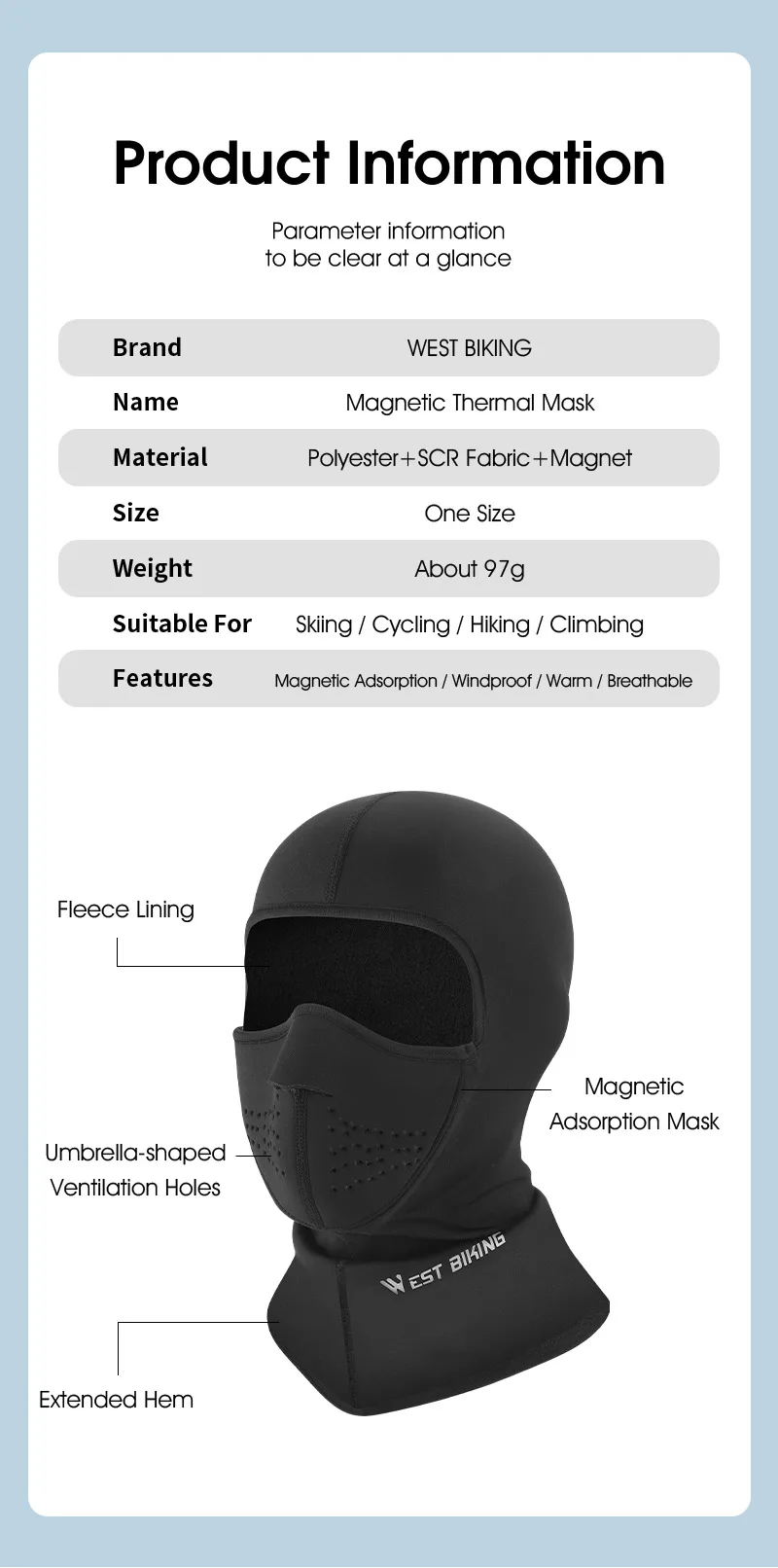 The magnetic mask offers a hood, face mask, and neck warmer in one. It is constructed of Highly stretch, warm performance fleece with a contoured 3D face mask