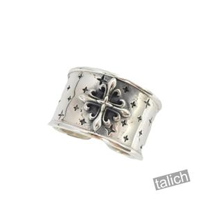 925 Sterling silver wide band wrap ring features ornate cross in center, tiny cross/star stamped on ring band. Well crafted with great details! Thick and sturdy. Shiny polished surface. Elegant unique statement piece!