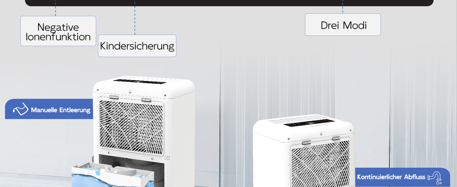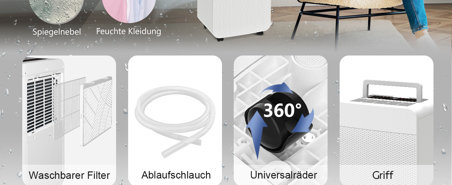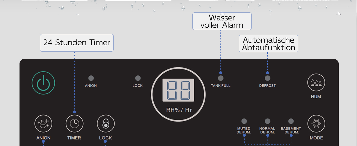 【Intelligenter Feuchtigkeitssensor】Entfeuchter Über das LED Display können Sie Soll-Luftfeuchtigkeit, Timer und Modi einstellen. Dehumidifier Wählen Sie einfach ihre gewünschte Zielraumfeuchtigkeit zwischen 40% - 80%, und das Gerät schaltet sich automatisch ab, sobald das gewünschte Level erreicht ist, um Energie zu sparen. Darüber hinaus bewahrt Sie seine automatische Abtaufunktion vor Frostproblemen, die durch langfristige Entfeuchtung verursacht werden.