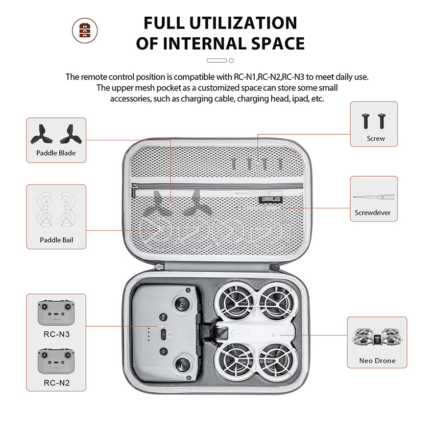 l Strong compatibility. Specially designed for DJI NEO, precise fit for your device, perfect storage, compatible with NEO aircraft, RC-N3 remote control (compatible with RC-N2)