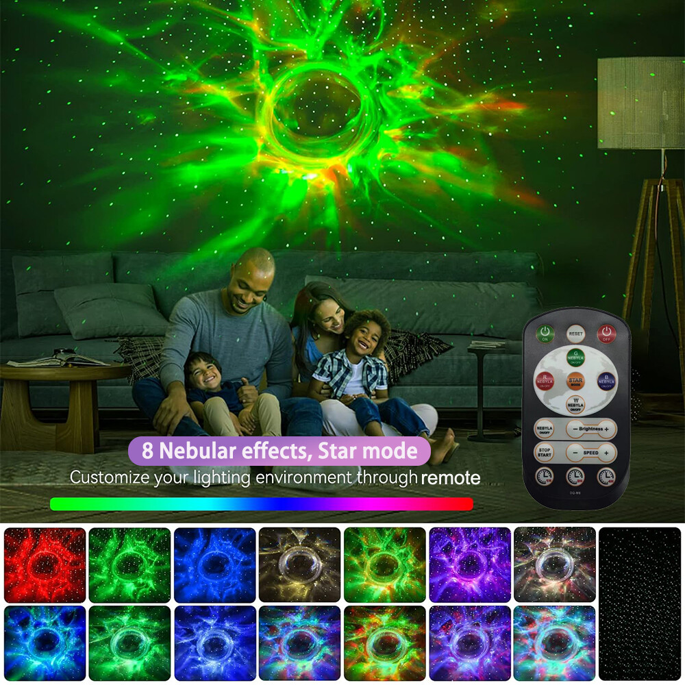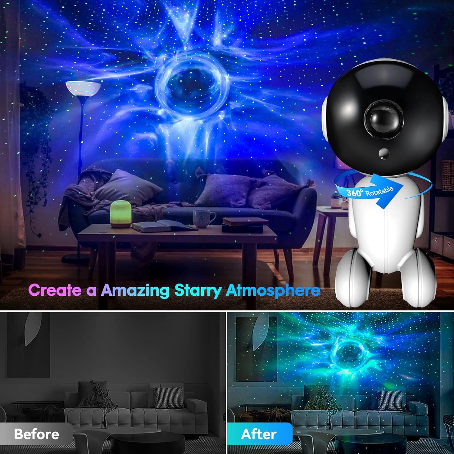 [Robot Nebula Star Projector] This star projector night light features 8 stunning nebula effects accompanied by twinkling green stars. Project it onto the wall or ceiling of your room and it will bring the galaxy space light for you, creating a peaceful and relaxing atmosphere. Great ambient light for movie nights, date nights or game setups.
