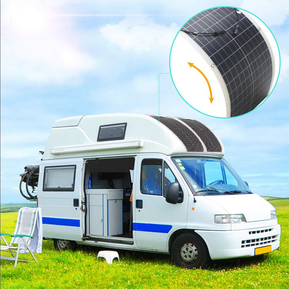 [Gute Flexibilität] Dieses flexible Solarpanel ist in der Lage, eine breite Palette von Anwendungen zu erfüllen. Es ist erlaubt, auf Anhängern, Booten, Kabinen, Zelten, Autos, Lastwagen, Anhängern, Yachten, Anhängern, Dächern oder jeder anderenunregelmäßigen Oberfläche installiert zu werden.