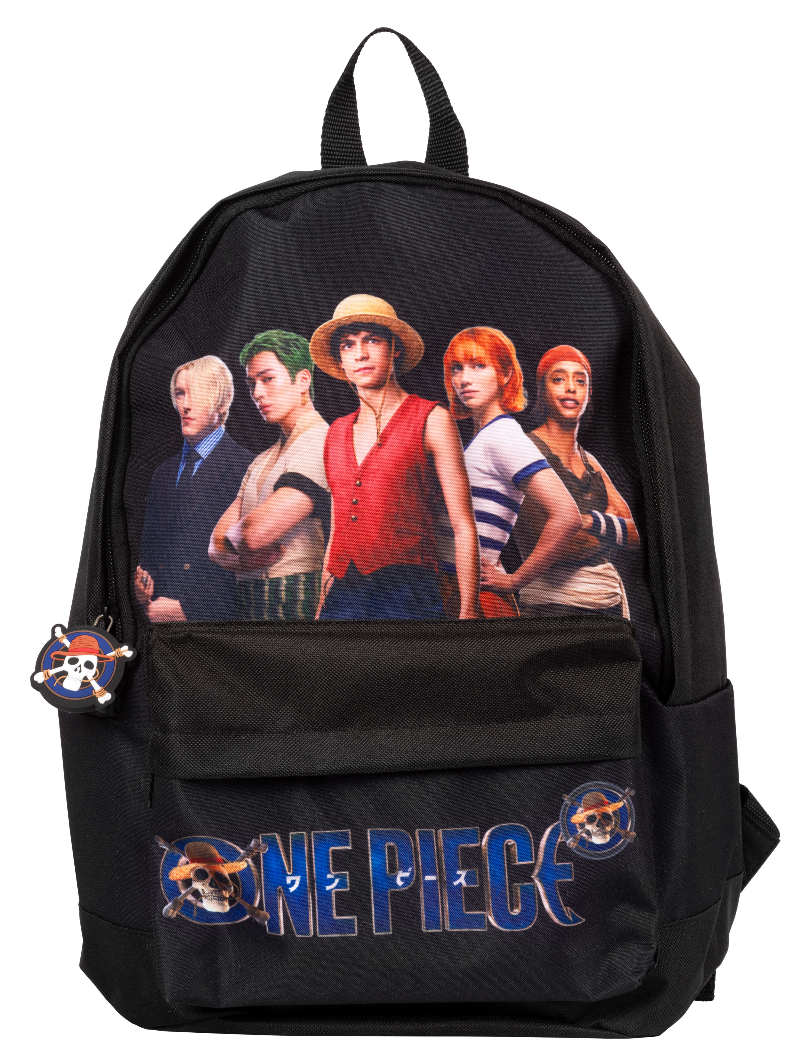 Der schwarze Rucksack, auf dem fünf Charaktere aus der Serie "One Piece" zu sehen sind, ist aus Polyester gefertigt und ca. 42cm hoch. Er hat verstellbare Tragegurte und neben dem Hauptfach noch eine weitere Vordertasche mit Reißverschluss, auf der großer blauer "One Piece"-Schriftzug aufgedruckt ist.