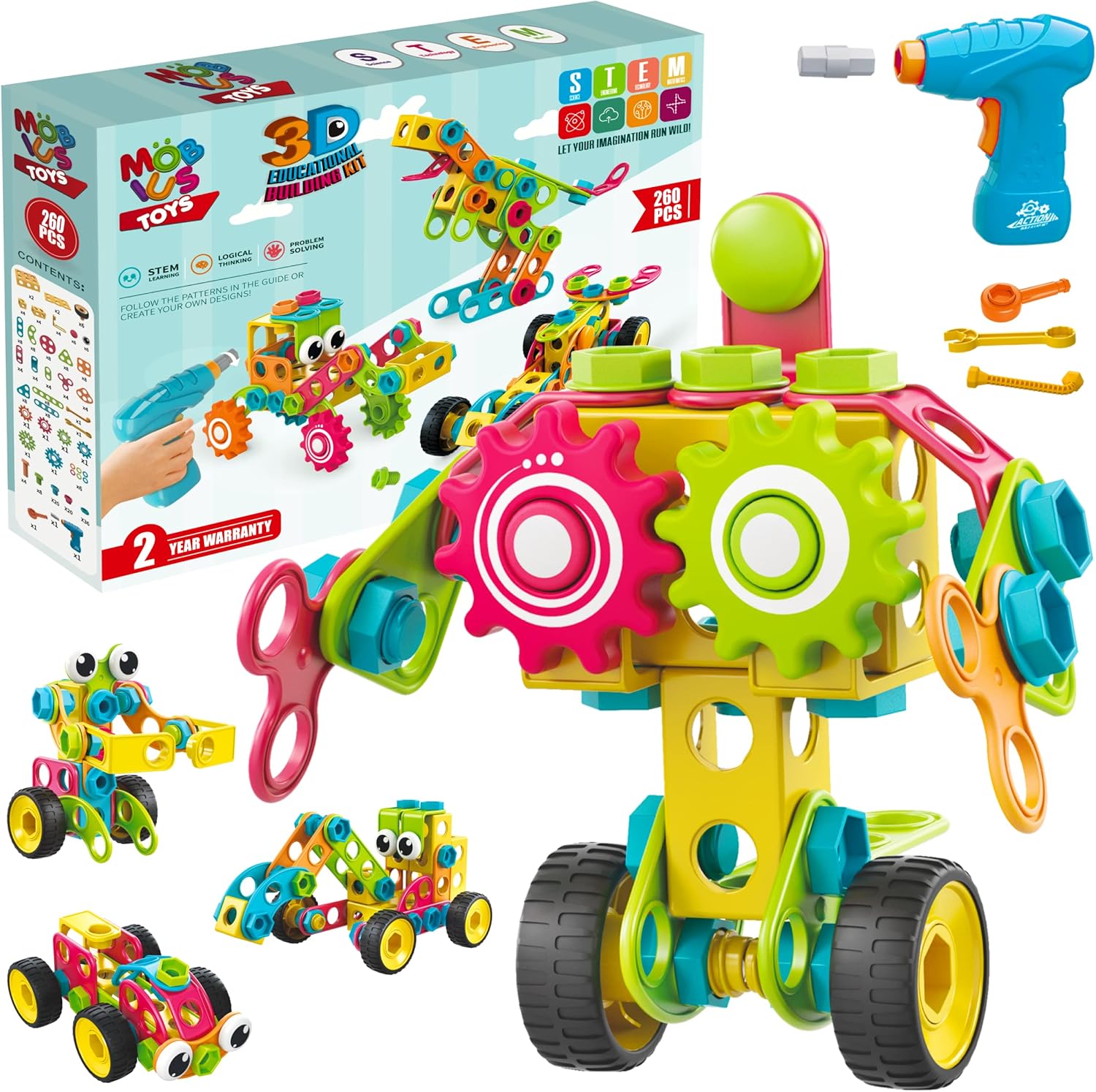 A WHOLE NEW WAY TO BUILD & PLAY: Each building blocks set include an assorted variety of different shapes and colors that kids absolutely love. A construction toy set has ever been more engaging! Kids drill set in a variety of geometric shapes, with Car Wheels, Cogwheels & Electric Screwdriver. The Mobius STEM Construction Toy allows kids to build models like no one else and give you and your children a unique playing experience to cherish forever