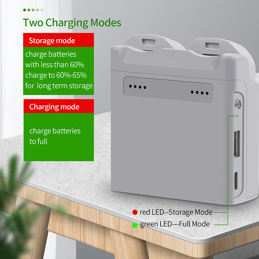 l Intelligent matching function, according to the input power, the charger will automatically identify the two batteries to be matched for simultaneous charging or charging one by one