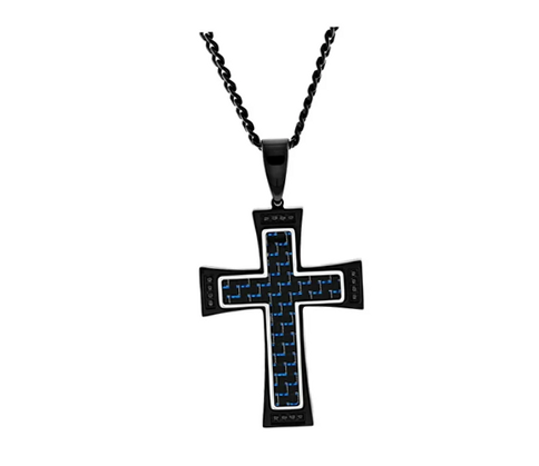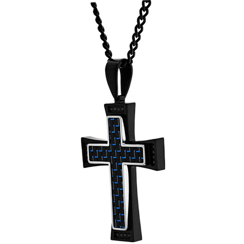 Take your faith whereever you go when you wear our men’s casual two-tone black stainless steel carbon fiber cross pendant. This charming pendant features a rich two-tone carbon fiber center filled with the colors black and electric blue, and is outlined with a high polish silver-tone border. Each edge of this cross pendant is lined with four black cubic zirconia stones, giving it a trendy appeal for casual or formal wear. Complete with a matching black 24-inch curb chain and durable lobster claw clasp, our men’s two-tone black stainless steel carbon fiber cross pendant is ready-to-wear!