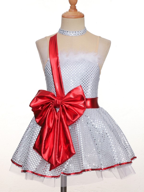 Kids Girls Round Neck Sleeveless Mesh Bowknot Sequins Adorned Dance Leotard Dress.