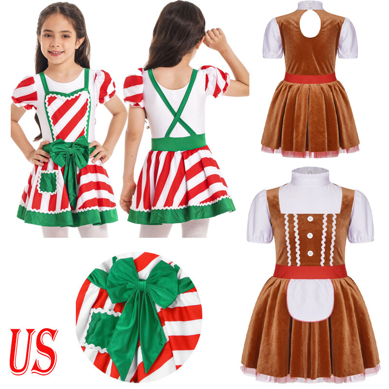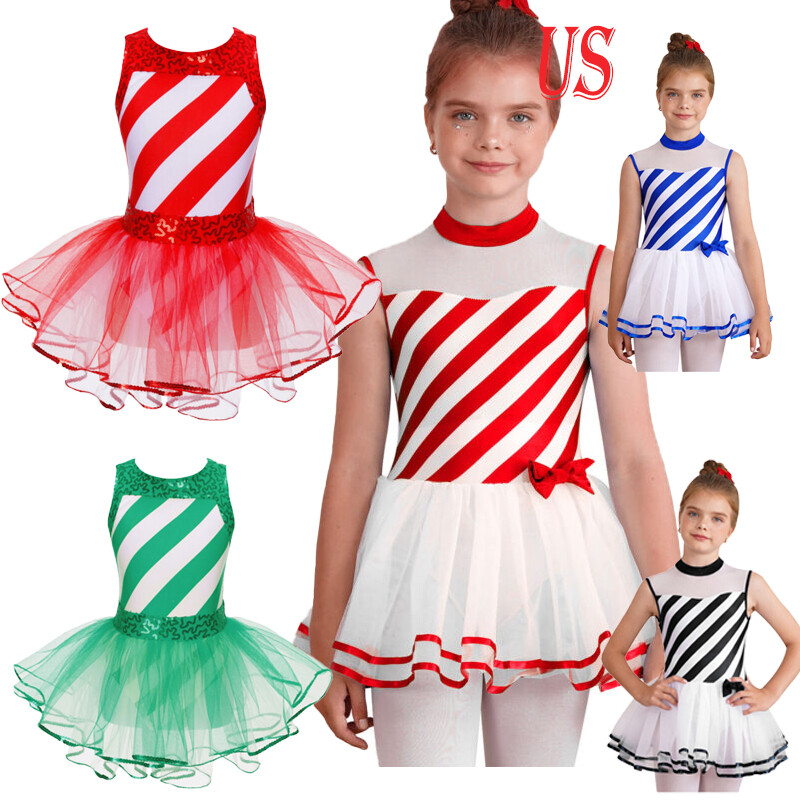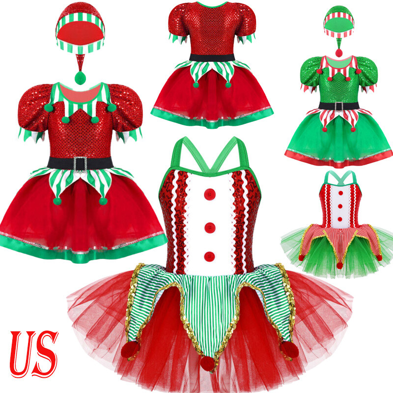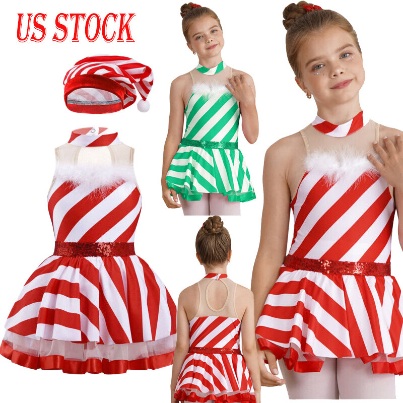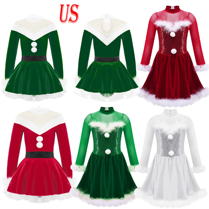 US Kids Girl Dresss Christmas Cosplay Santa Costume Figure Ice Skating Dancewear