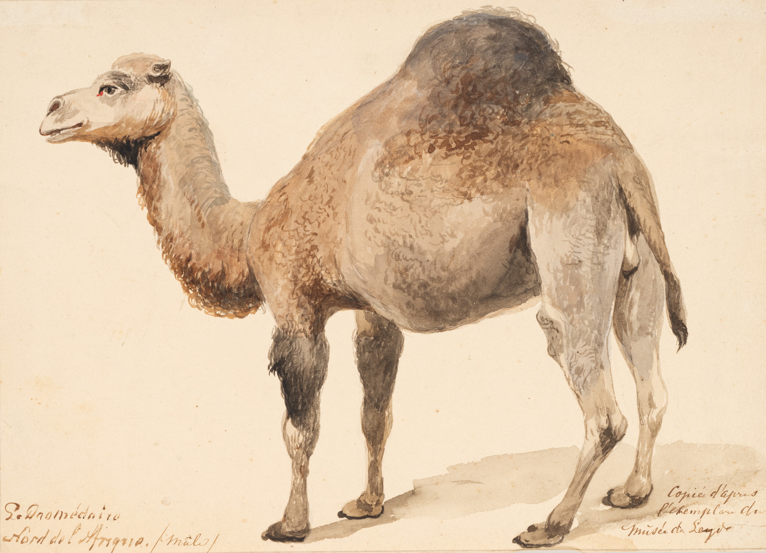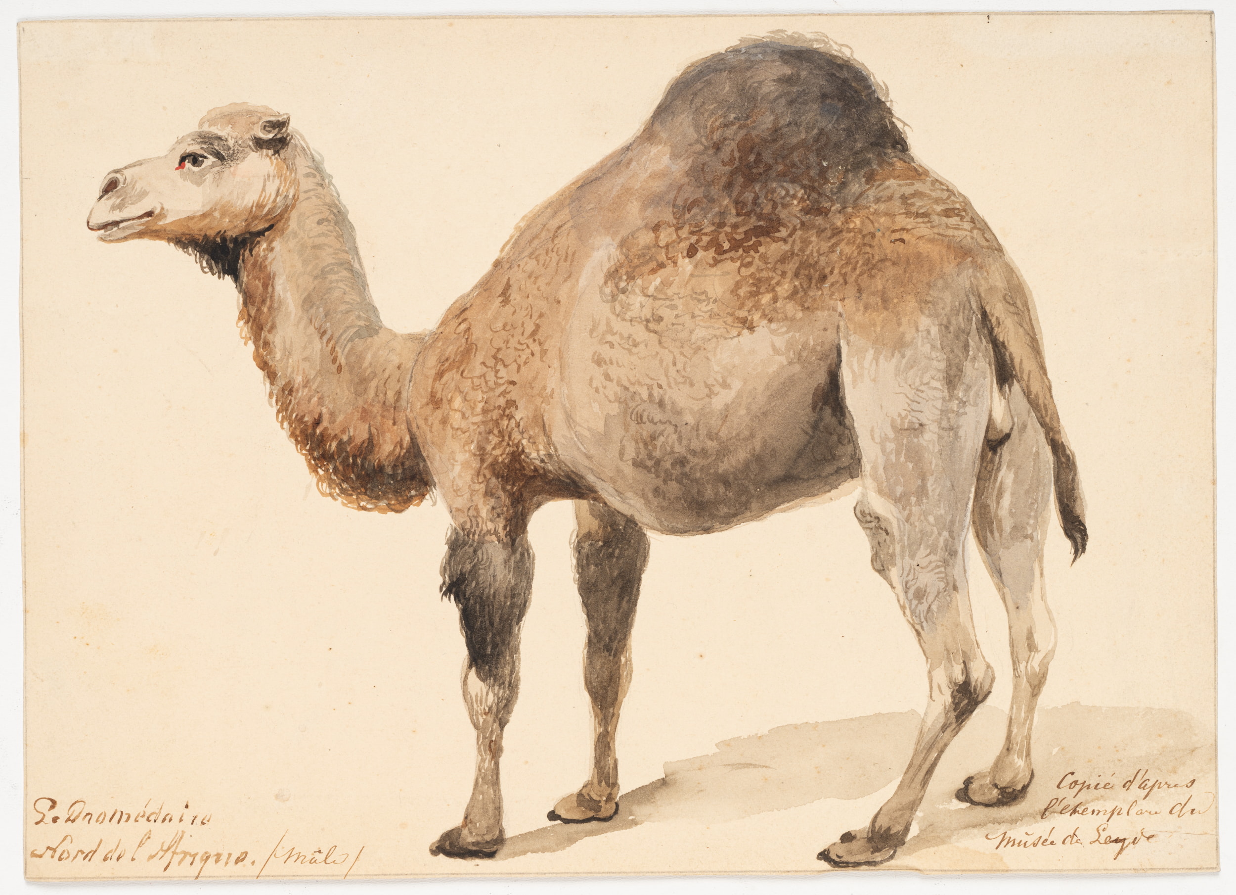 - Keywords: Dromedary; camel; anatomical study; scientific drawing; animal depiction; profile view; Musée de Leyde; colouring; documentation; natural history; copy; precision; classical art; animal portrait; illustration; zoology; animal anatomy; research; art science; historical drawing;, 19th century, Romanticism, Animals, France,