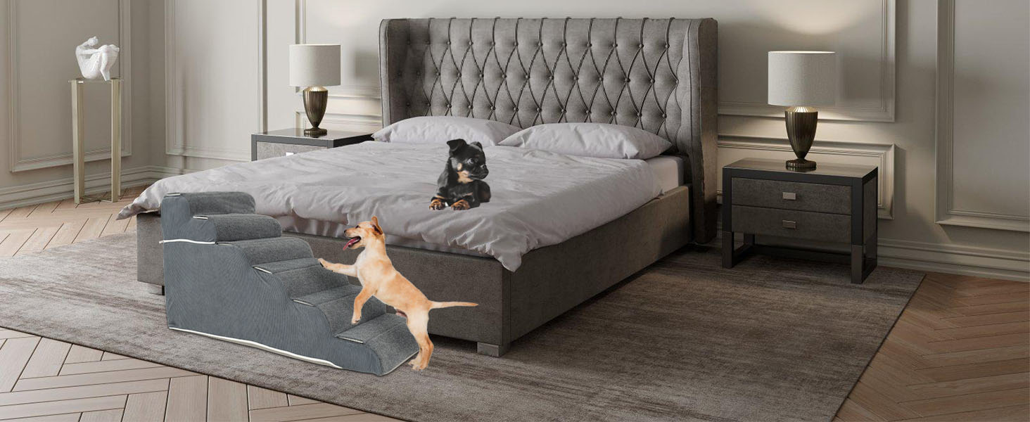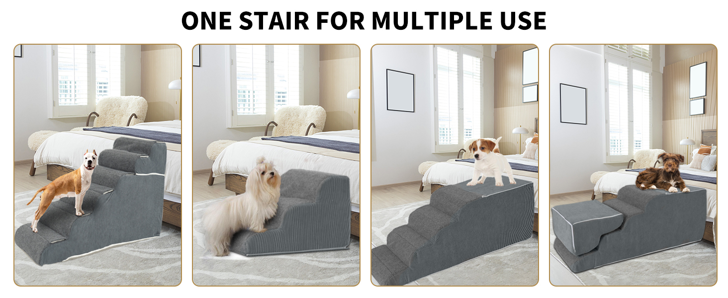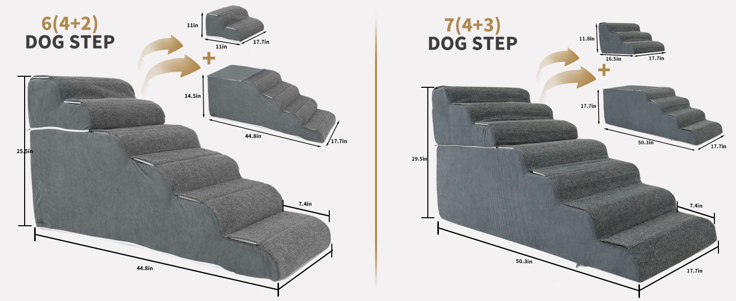 Customizable Height for Every Adventure: Our dog stairs with 6-step and 7-step designs ,which is uniquely crafted to adapt to your pet's needs. The modular design allows for easy assembly simply zip or unzip the sides to create a 4+2 or 4+3 configuration. Whether your pet needs a gentle incline or a higher climb, these stairs grow with them, offering comfort and confidence every step of the way