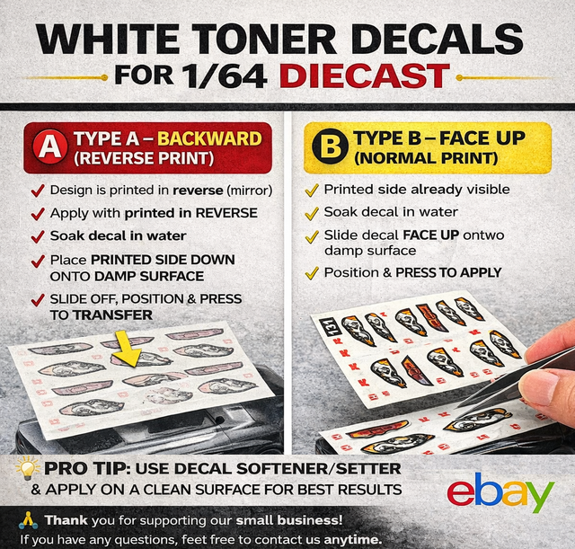 We offer 2 types of white toner decals for 1/64 diecast customization.