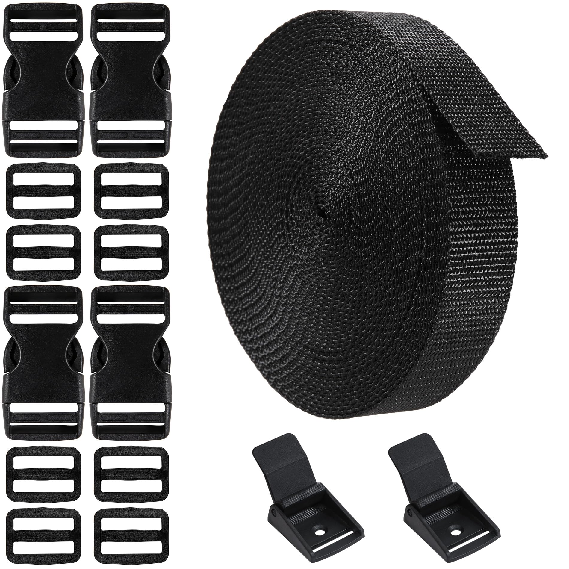 - [Nylon strap & Buckle] 5.5 yards length nylon straps 1 inch wide of 0.06" thickness, 4 PCS plastic buckle clips, 2 PCS cam buckles and 8 PCS tri-glide slide clips.