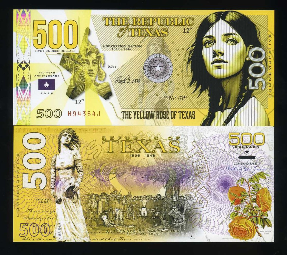 Republic of Texas $500, Polymer ND (2024) UNC Yellow Rose of Texas, Emily West