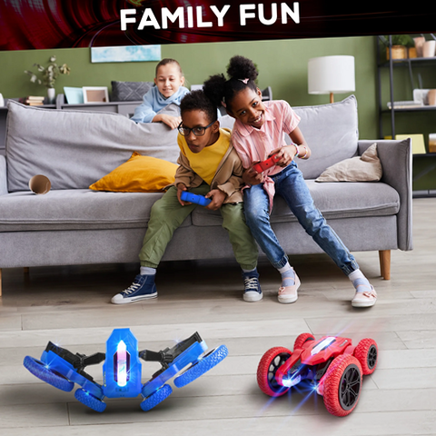 This versatile RC car is designed for thrilling stunts with its 2-sided off-road driving capability, bright LEDs, and rugged rubber tires. Control is a breeze with the easy-to-use 2.4GHz remote, allowing for 360° flips, spins, and turns at the push of a button. Its shockproof design ensures endless fun on any terrain, while the rechargeable battery provides up to 25 minutes of playtime.