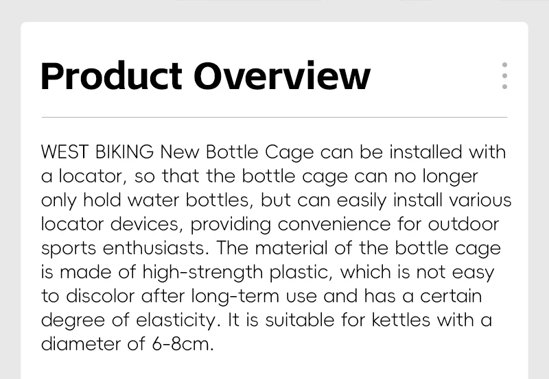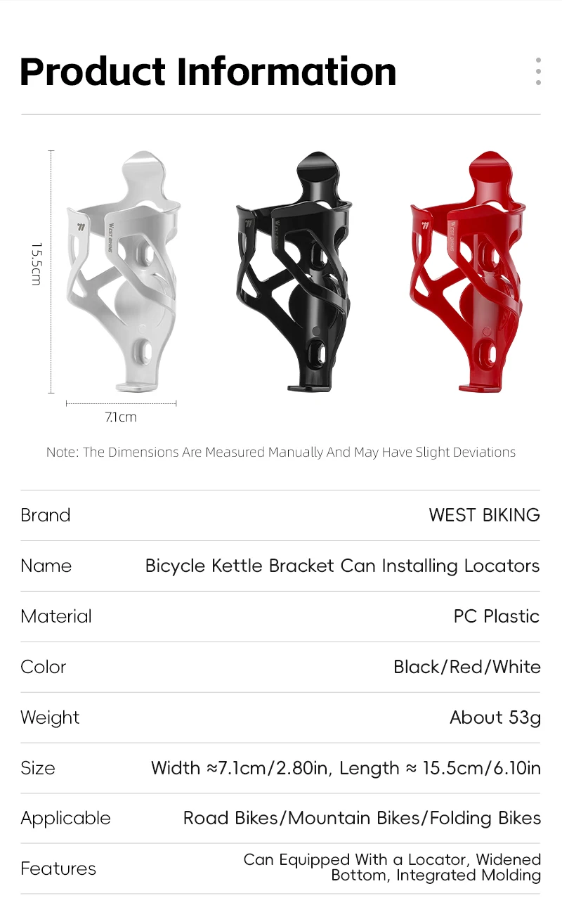 WEST BIKING New Bottle Cage can be installed with a locator, so that the bottle cage can no longer only hold water bottles, but can easily install various locator devices, providing convenience for outdoor sports enthusiasts. The material of the bottle cage is made of high-strength plastic, which is not easy to discolor after long-term use and has a certain degree of elasticity.lt is suitable for kettles with a diameter of 6-8cm.